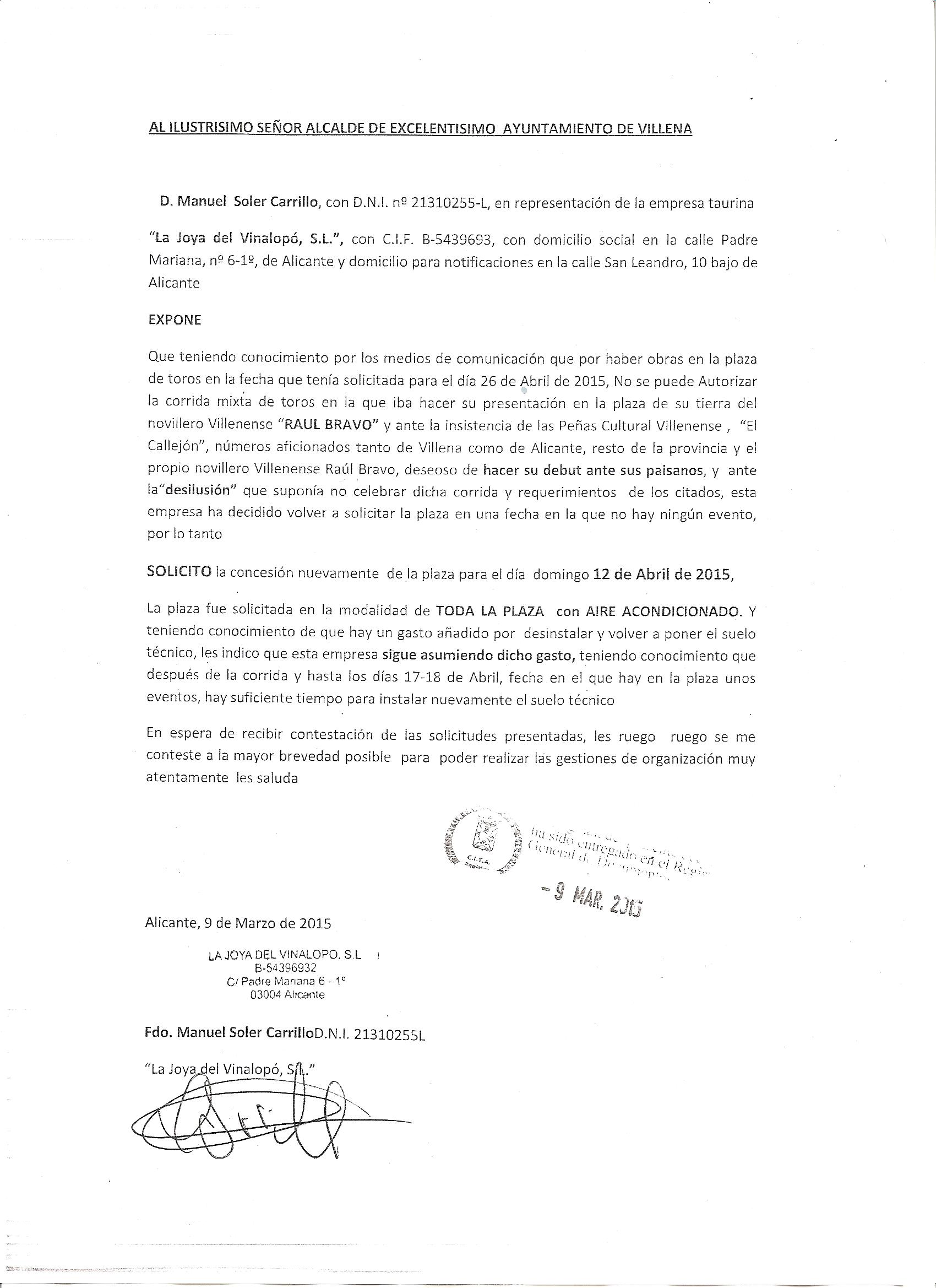 El empresario taurino Manolo Carrillo vuelve a la palestra para que se realicen toros en Villena. Después de que la propuesta presentada por el promotor de la empresa La Joya del Vinalopó SL, solicitando la Plaza de Toros para realizar una corrida mixta el día 26 de abril, fuera rechazada por el alcalde, esta misma mañana se ha solicitado el coso para el domingo día 12 de abril.