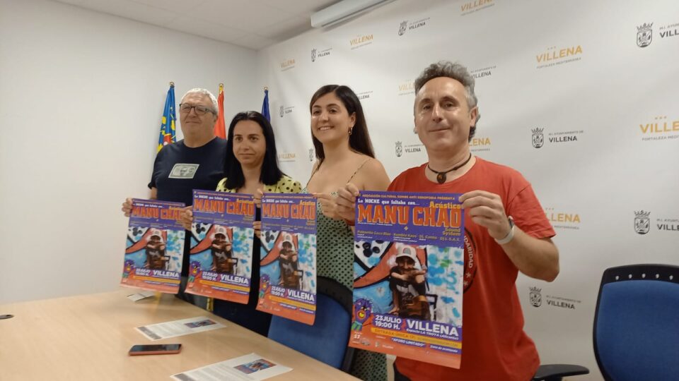 El Ayuntamiento de Villena y la Asociación Cultural Somos Anti Xenofobia han presentado hoy el concierto del artista hispano-francés, Manu Chao, que tendrá lugar el próximo 23 de julio en La Troya, en la velada denominada ‘La noche que faltaba…’. El artista hispano-francés es la primera vez que visita la provincia de Alicante y abre el periodo de festivales de verano de Villena, anterior a la celebración de Leyendas del Rock y Rabolagartija, ya en agosto.