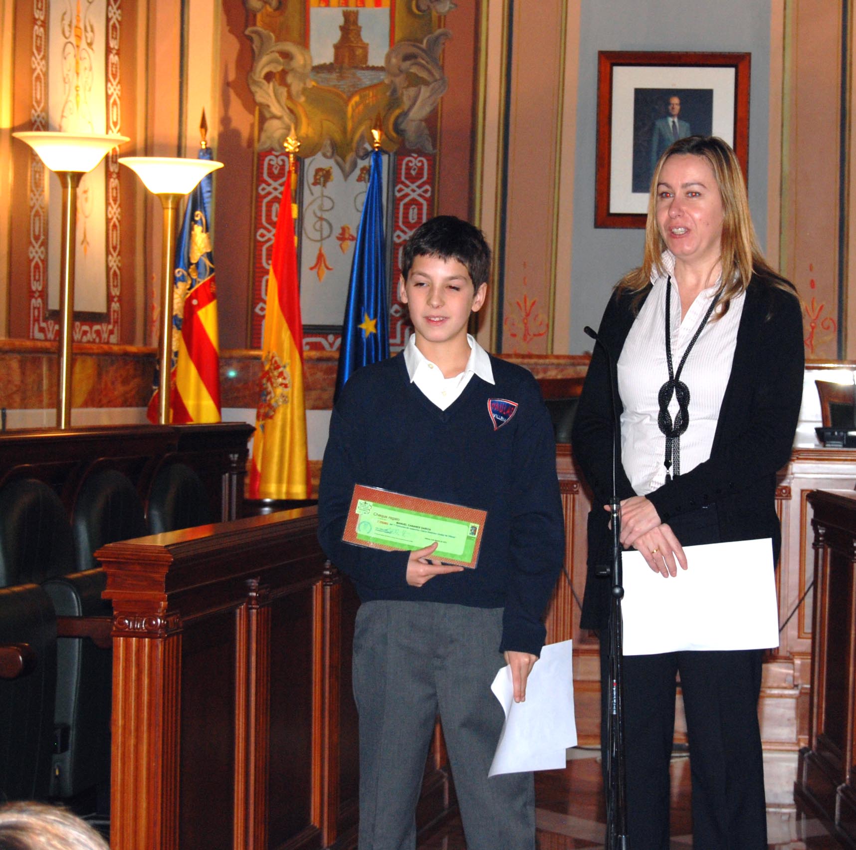 A comienzos del mes de diciembre, 375 alumnos de 6ª de Primaria procedentes de todos los centros de la ciudad, acudieron a la Plaza de Santiago para participar en el I Concurso de Redacción Casco Histórico de la Ciudad de Villena. Esta mañana, el Salón de Plenos del M.I. Ayuntamiento de Villena ha recibido a los primeros tres clasificados, donde la edil de Patrimonio del Ayuntamiento, María José Hernández, ha hecho entrega de los respectivos cheques premiados a los ganadores.
