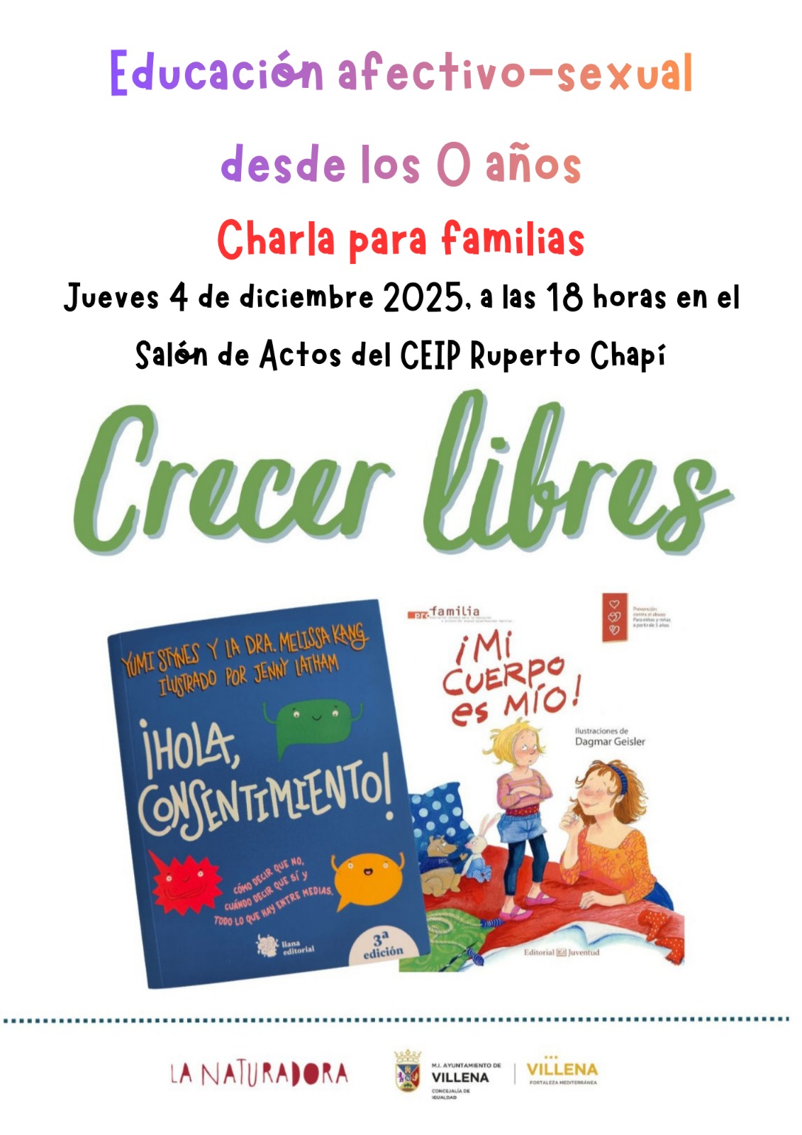 Dirigido a las familias, mañana jueves 4 de diciembre a las 18:00h en el Salón de actos del C.E.I.P Ruperto Chapí se impartirá una charla sobre educación afectivo-sexual para que las familias puedan establecer canales de comunicación con sus niñas y niños sobre cómo abordar este tema dentro del núcleo familiar, dando herramientas e información didáctica.