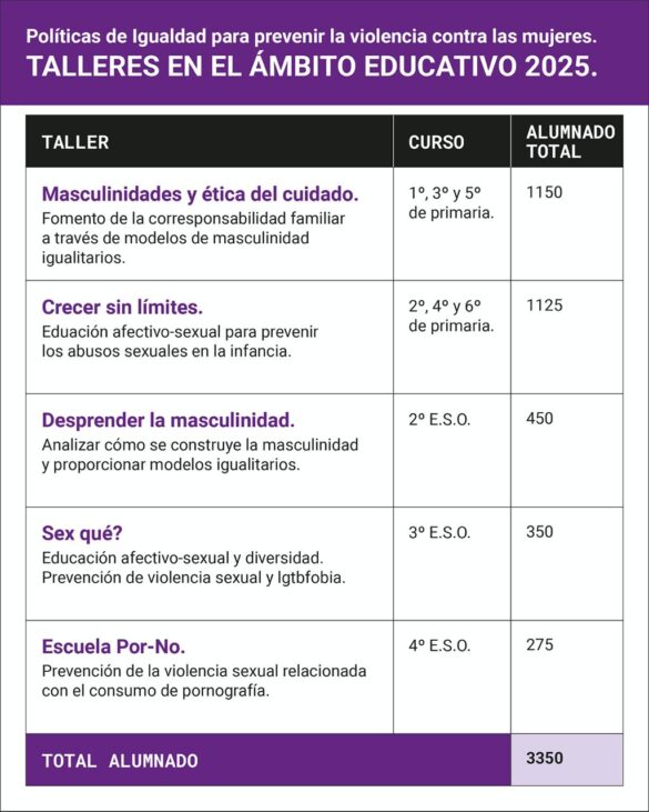 Los cursos han atendido a escolares de Primaria y Secundaria con talleres como ‘Masculinidades y ética del cuidado’, ‘Crecer sin límites. Coeducación afectivo-sexual’, entre los niveles de Primaria. Los estudiantes de Secundaria participaron en los talleres ‘Desaprendiendo las masculinidades’, ‘Sex qué? Coeducación afectivo-sexual’, y ‘Escuela Por-No. Prevención de las violencias sexuales’.