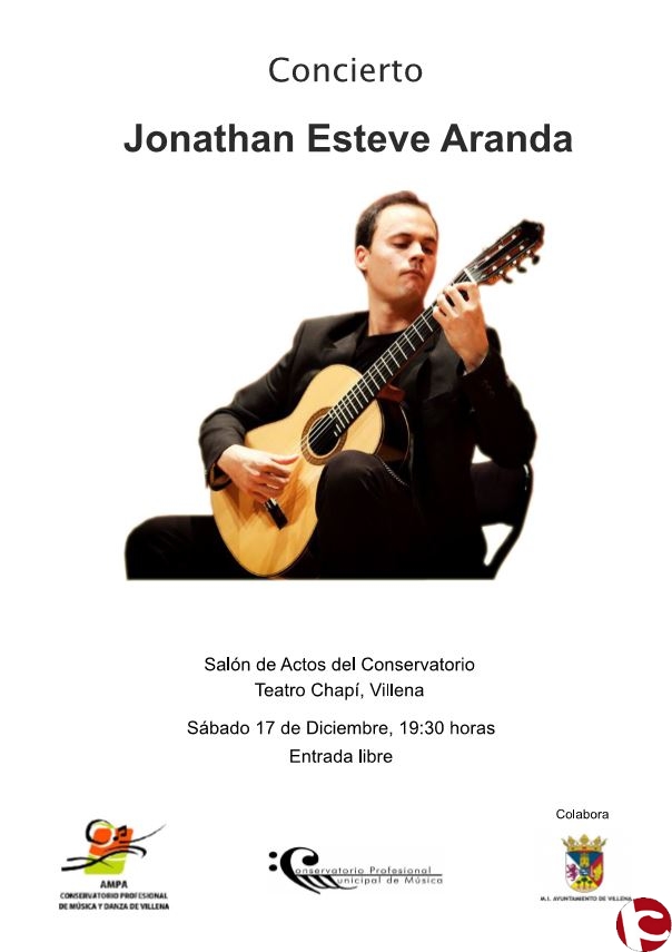 El próximo sábado se ha organizado por parte del AMPA del Consevatorio de Villena una Master Class de guitarra, que acabará con un concierto impartido por el profesor Jonathan Esteve Aranda (gran guitarrista) en el Salón de Actos del Conservatorio (Sala situada en el ala lateral del Teatro Chapí) a las 19:30 h. La entrada es libre.