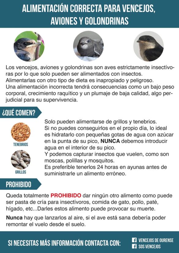 Por último, el Ayuntamiento recuerda que los vencejos, al igual que aviones y golondrinas, son aves insectívoras y no pueden alimentarse con otro tipo de dietas, como pan, leche, pienso o comida para otros animales. Una alimentación incorrecta puede provocar su muerte o graves daños.
