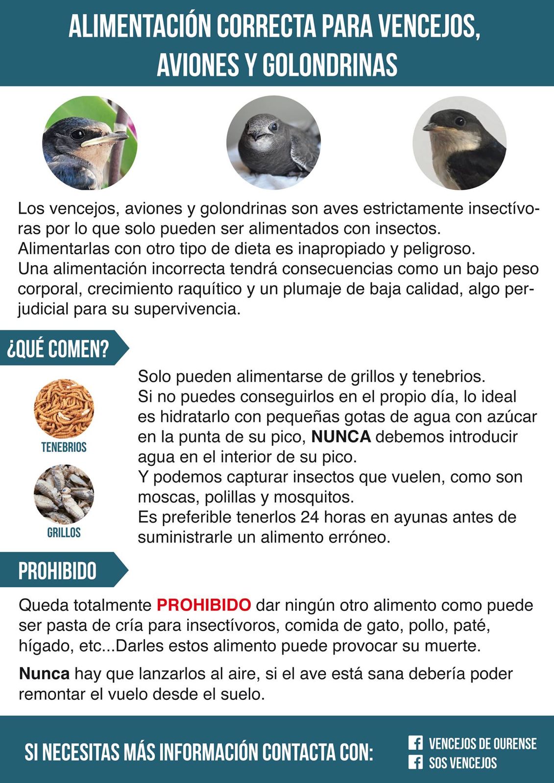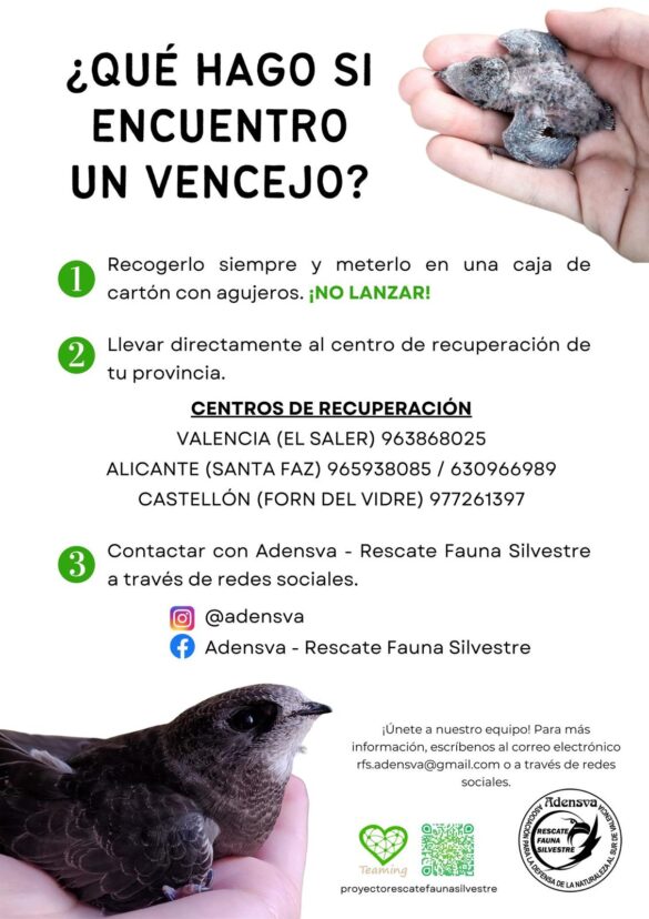 En caso de encontrar un pájaro, se puede contactar con la asociación Adensva – Rescate Fauna Silvestre que trabaja en la recuperación de vencejos en la Comunidad Valenciana (Instagram: @adensva y Facebook: Adensva – Rescate Fauna Silvestre). También se recomienda llamar a un centro de recuperación oficial. En el caso de Villena, el más cercano es el de Santa Faz (Alicante), cuyo teléfono es 965 938 085. Iniesta también ha querido agradecer la implicación por parte de la Asociación Salvatierra de Villena.