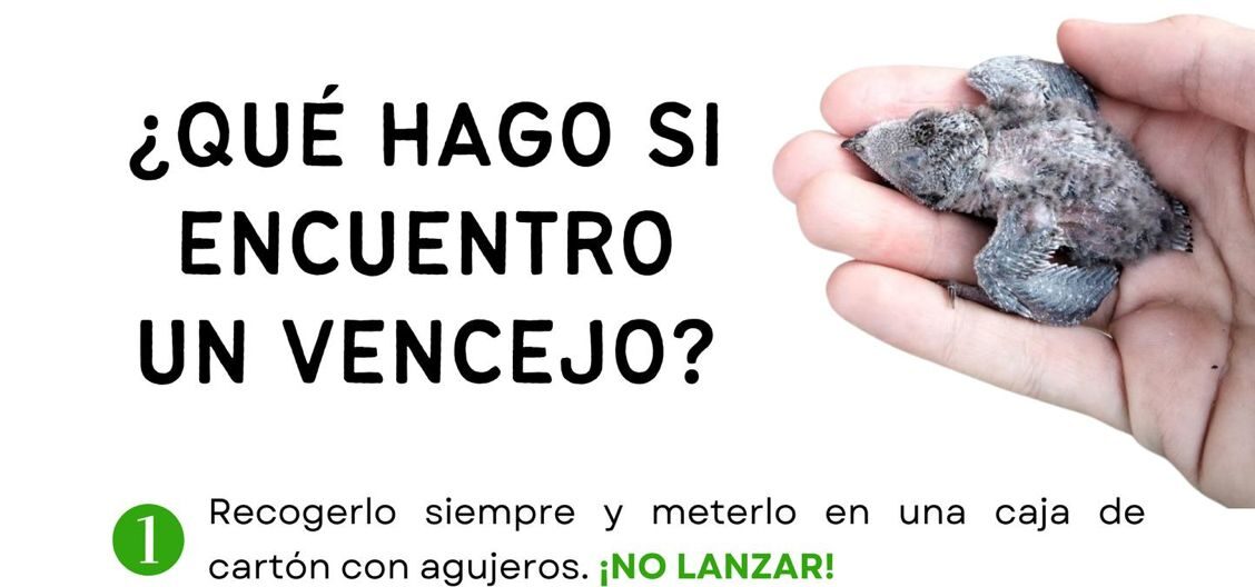 Desde el Ayuntamiento se quiere reforzar el mensaje de que nunca deben lanzarse los vencejos al aire, ya que si están en el suelo es porque algo les ocurre o son demasiado jóvenes. Lo correcto es meterlos en una caja de cartón con agujeros para que puedan respirar bien, colocarlos en un lugar tranquilo y no darles ni agua ni comida, salvo indicación expresa.