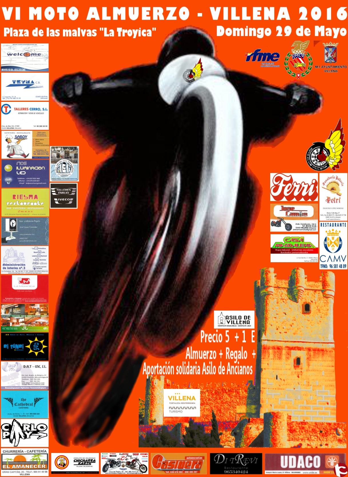 Este próximo domingo, último de mayo, los aficionados al motociclismo en cualquiera de sus modalidades o estilos tiene una cita con el VI Motoalmuerzo en Villena. Se celebrará en La Troyica a partir de las 9:00 horas y tendrá una aportación solidaria para la rehabilitación y construcción del nuevo asilo de ancianos en Villena y habrá un regalo para cada uno de los asistentes.