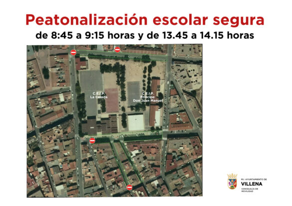 Los cortes de acceso comprenden todos los días lectivos entre la 8.45 y las 9.15, y desde las 13.45 hasta las 14.15 horas. Las calles que se verán afectadas son Pascual Marquina, San Bartolomé, Luis García, Beneixama, Cardenal Cisneros, Dámaso Alonso, Sax, El Copo, Coronel Selva y Hernández Villegas. La Concejalía pretende con esta iniciativa establecer accesos seguros a los centros escolares y potenciar los desplazamientos con una reducción del uso de los vehículos privados a motor, fomentando el uso de sistemas alternativos como la bicicleta u otros no contaminantes.