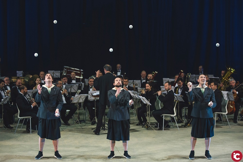 En este concierto tan circense, los malabares se convierten en bailarines aéreos. Se elevan en el cielo y coquetean con la música, cuyos acordes marcan el ritmo de su evolución. El nuevo circo también es esto: otras propuestas que arrancan la sonrisa y consiguen la expectación del público. Clarinetes, saxos y trompetas son los pintores expresionistas que preparan el lienzo para que las bolas, mazas y aros dibujen, al tomar altura, los sentimientos y las emociones que se transmiten sobre el escenario. Y todo ello sin la mas mínima sobriedad, porque los instrumentos dorados, grandes tambores y uniformes de músico, conviven en este espectáculo con los pantalones cortos, las camisetas, las gafas de sol, la música pop, el punk, el funk y el blues.