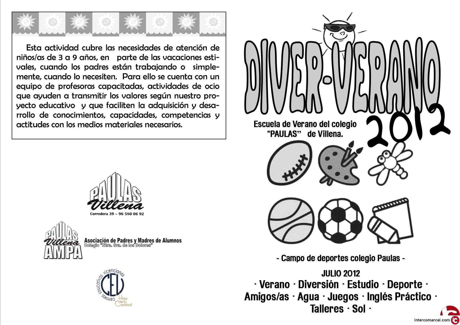 El colegio PAULAS de Villena, informa que este verano en el mes de julio, va a realizar por primera vez una escuela de verano DIVER-VERANO 2012. Esta actividad se realizará en el Campo de deportes del colegio «PAULAS» situado en el camino de San Juan.