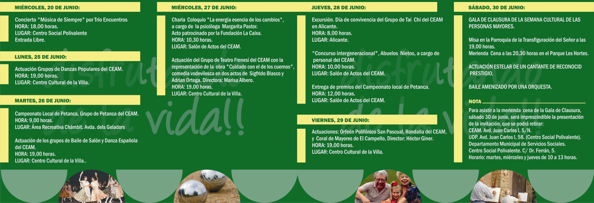 Un año más, se realiza esta semana dedicada a los más mayores, que tendrá inicio el lunes, 25 de junio, con la actuación de Grupos de Danzas Populares del CEAM, y donde, a lo largo de la semana se realizarán distintas actividades de diversa índole tales como: campeonatos de petanca, actuaciones de bailes de salón y danza española, charlas – coloquio, teatro, cursos intergeneracionales para que participen abuelos y nietos e, incluso, está previsto un día de convivencia en Alicante.
