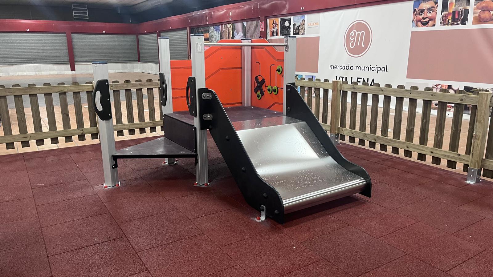 El Ayuntamiento de Villena ha completado la renovación integral de la zona de juegos infantiles del Mercado Municipal con una inversión de algo más de 12.000 euros, de los cuales el 46,67% ha sido financiado por la Diputación Provincial de Alicante a través del Plan de Modernización de Mercados Municipales.