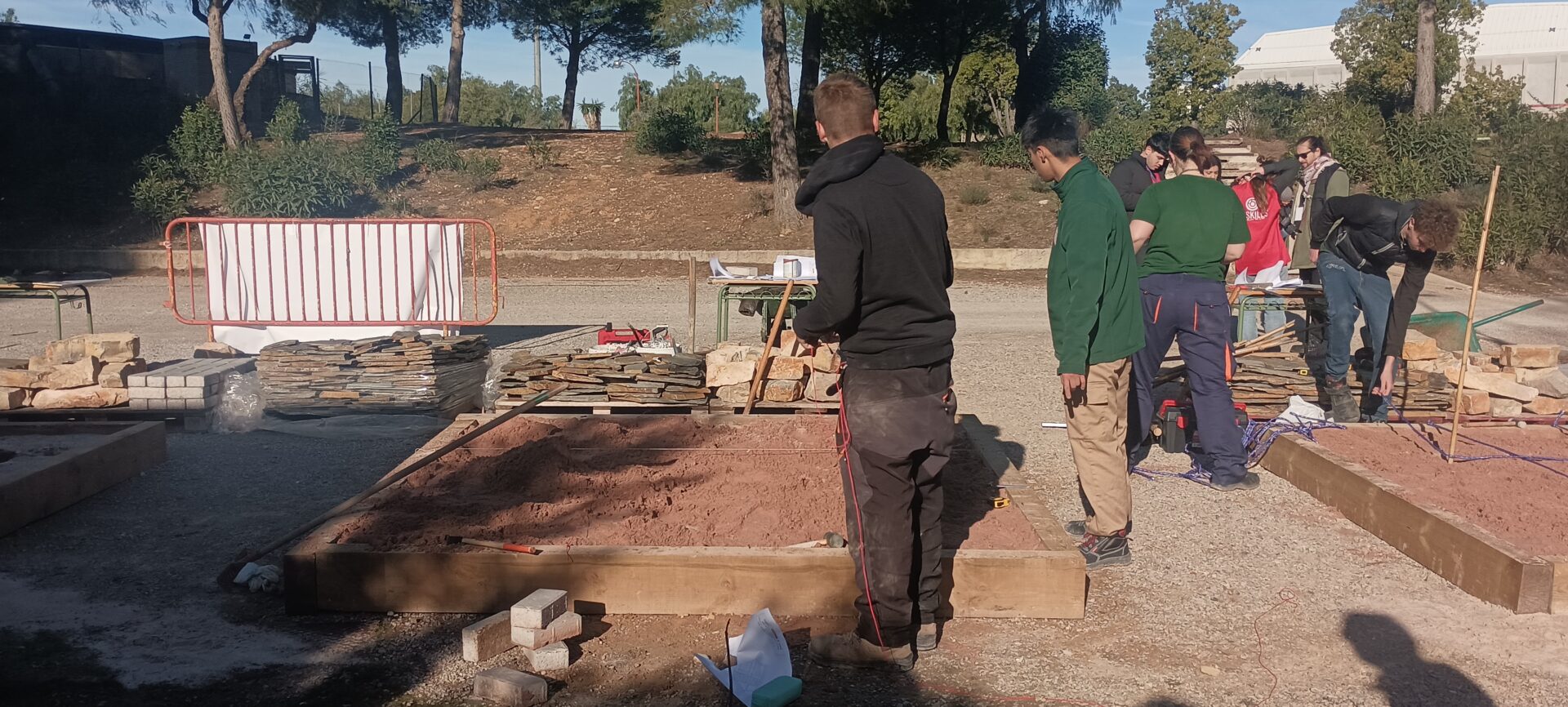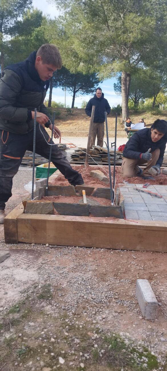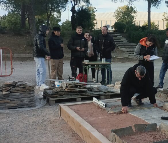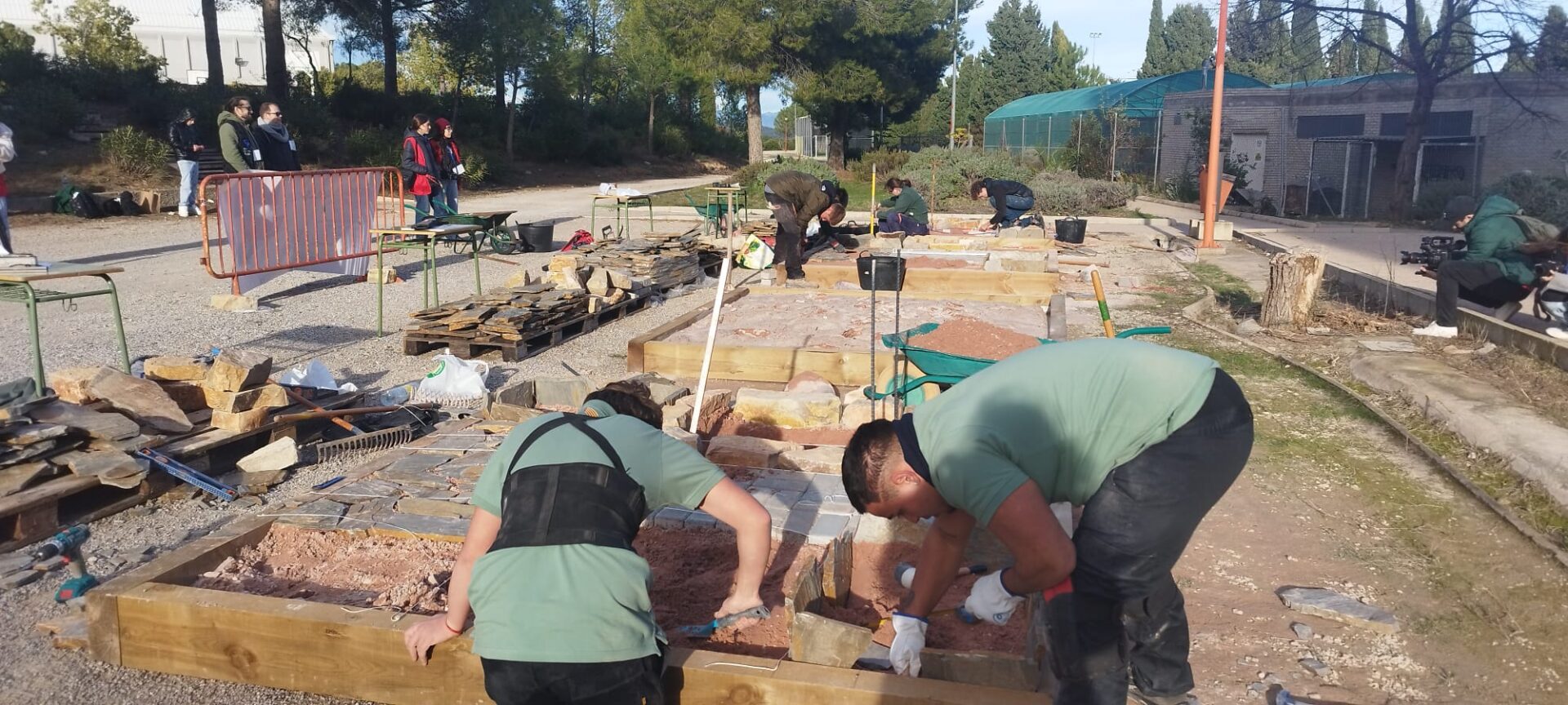 La prueba de la especialidad de Jardinería consistió en la ejecución de un espacio de 2,5 por 2,5 metros que incluía un camino de adoquines, un solado de lajas de pizarra, dos parterres con bordura y un estanque seco de mampostería. La organización facilitó los materiales y los planos, mientras que cada equipo debía aportar sus propias herramientas. En este aspecto, el equipo del IES Hermanos Amorós destacó por la amplia variedad de herramientas y materiales utilizados, lo que se tradujo en un acabado de gran calidad.