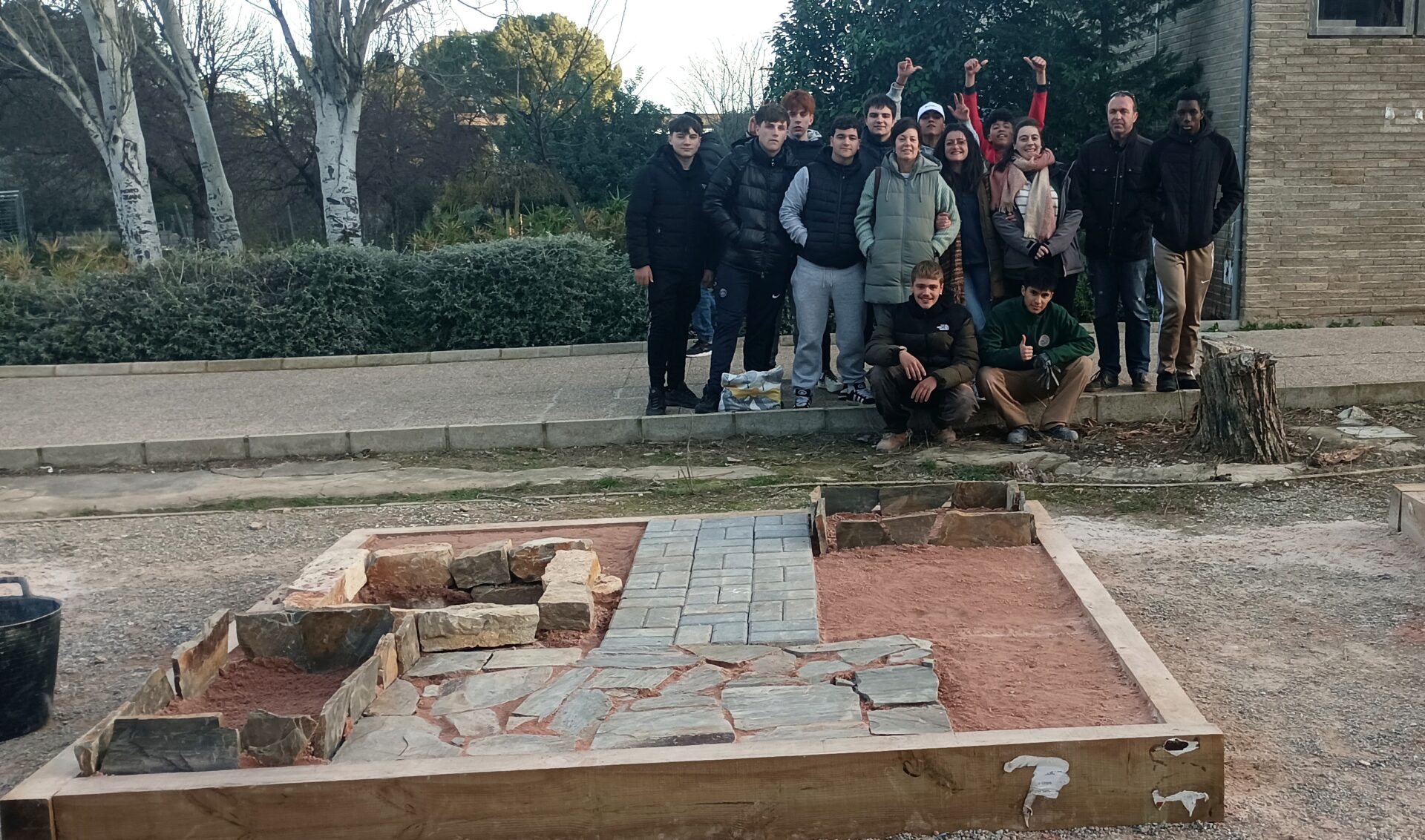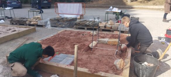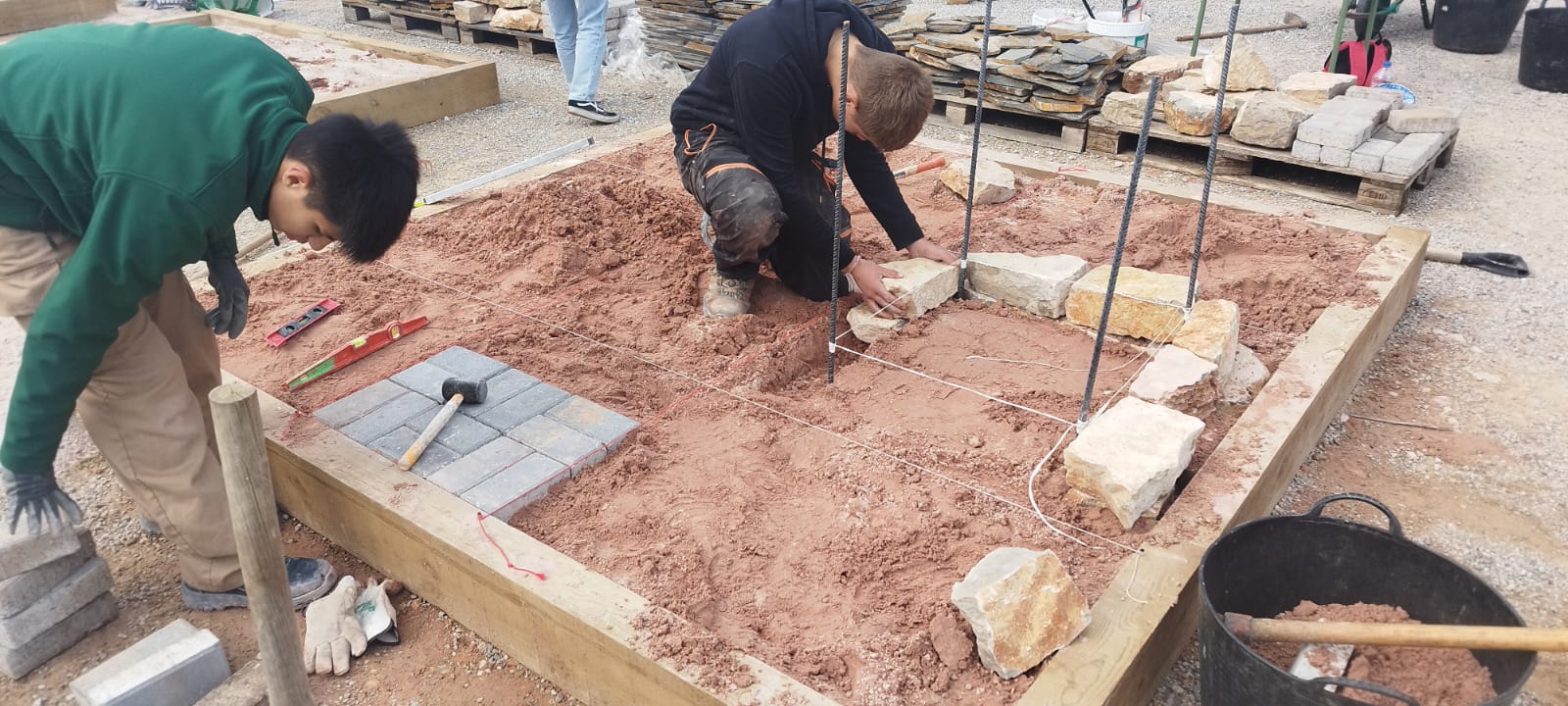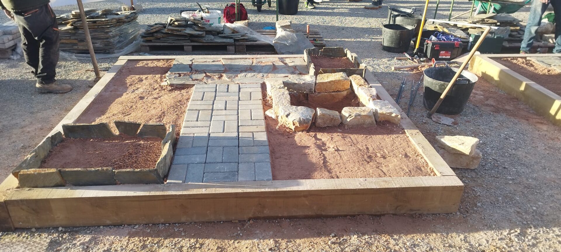 La prueba de la especialidad de Jardinería consistió en la ejecución de un espacio de 2,5 por 2,5 metros que incluía un camino de adoquines, un solado de lajas de pizarra, dos parterres con bordura y un estanque seco de mampostería. La organización facilitó los materiales y los planos, mientras que cada equipo debía aportar sus propias herramientas. En este aspecto, el equipo del IES Hermanos Amorós destacó por la amplia variedad de herramientas y materiales utilizados, lo que se tradujo en un acabado de gran calidad.