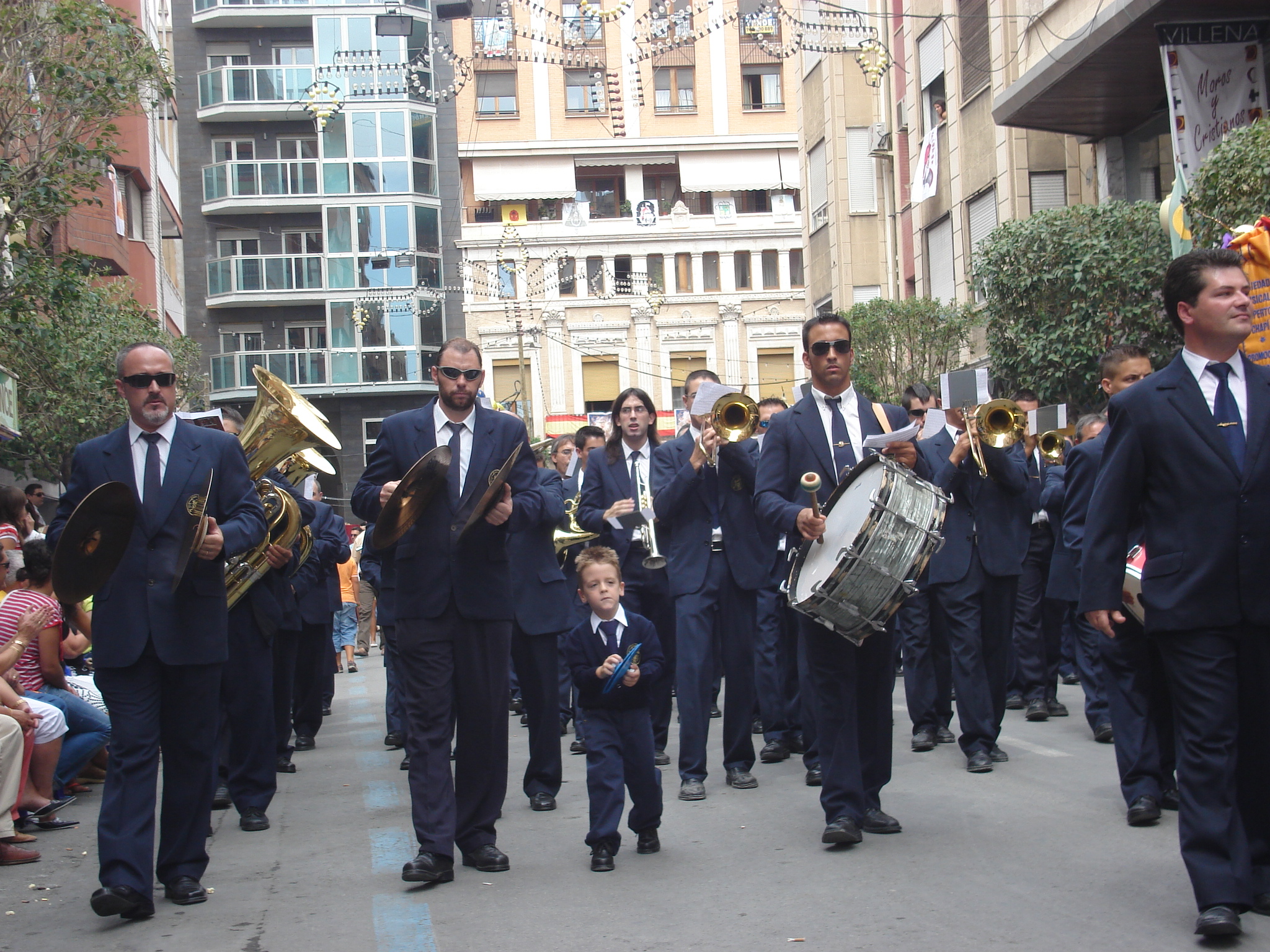 Marina, mi mujer, viendo que Pedro insistía una y otra vez se percató de aquella conversación y sin decirme nada hizo las gestiones hablando con Rafa (presidente) Damián (director) y Luis (ajustador) para que mi hijo Pedro pudiera salir a mi lado el día 5 en la Fiesta del Pasodoble. La respuesta fue afirmativa, después habló con Jerónimo para que le consiguiera un escudo para la camisa, buscó una corbata unos pantalones azules y unos zapatos, pero cuando lo tenía todo preparado surgió un pequeño problema. Pocos días antes de fiestas la directiva estimaba oportuno salir con el uniforme de invierno en dicho desfile y entonces le faltaba la chaqueta y sin esa prenda mi hijo no podía salir, entonces tuvo que comprar una chaqueta azul y conseguir otro escudo puesto que el anterior ya estaba cosido a la camisa. Pocos días antes mi mujer me preguntaba si iba a ver con ellos parte del desfile y yo le dije que no que me gustaba ver a las bandas de música salir desde la plaza de Santiago. Y llegó el día 5 de septiembre yo me subí sobre las 12 a escuchar el pregón y a ver la bandas de música cuando estaba saliendo la banda de los marruecos oigo PAPA y cuando me volví era mi hijo vestido de músico y con sus platillos azules, me llevé una grata sorpresa yo pensaba en un primer momento que no podía salir puesto que yo no había pedido permiso a nadie y me quede un poco extrañado pero mi mujer me comentó que ya estaba todo arreglado y que había hablado con las personas que antes he citado en este artículo. Empezamos a tocar el pasodoble REMIGIET y me iba emocionado cada vez más según iba transcurriendo el desfile el público que lo estaba presenciando le llamaba la atención ver a un niño tan pequeño tocando los platillos. Había veces que incluso llevaba el paso y tocaba alguna nota en su sitio. Nunca olvidaré el 5 de septiembre de 2.006. En la retransmisión de la tv intercomarcal me nombraron y dijeron que posiblemente fuera mi hijo.