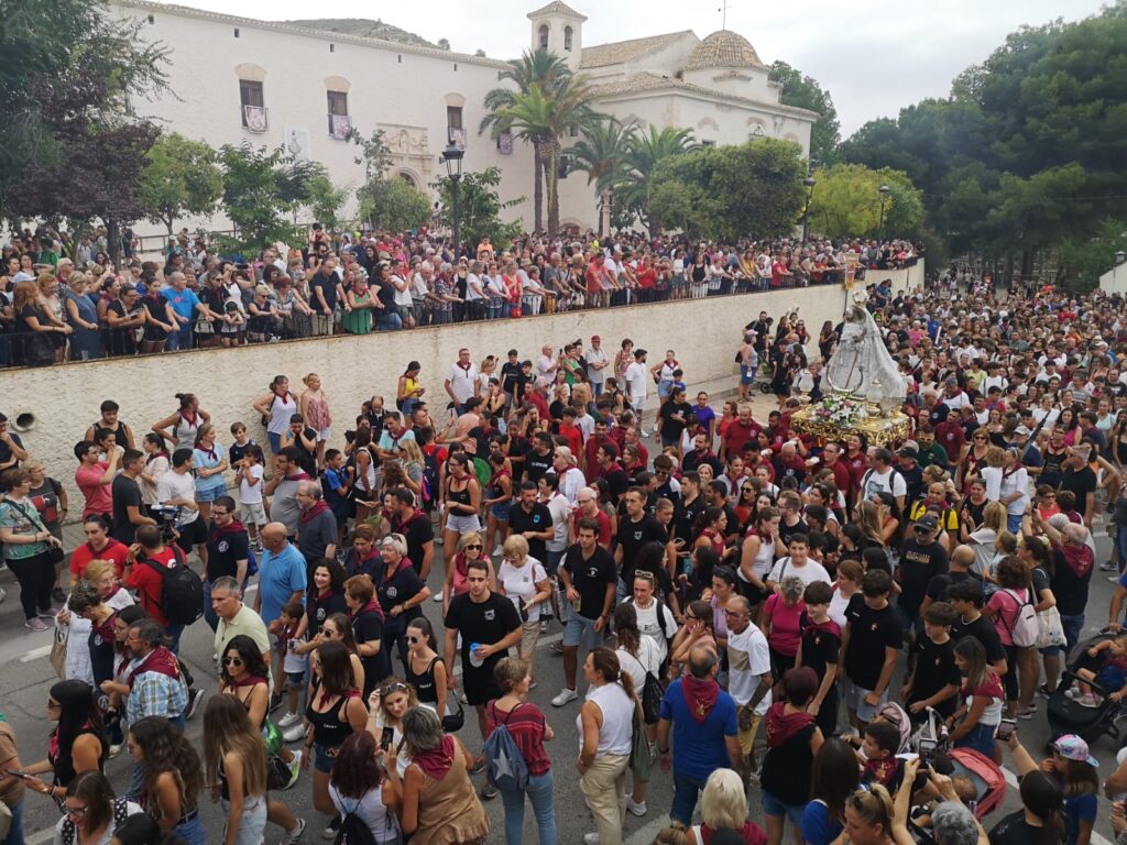 Salida en ROMERÍA, acompañando a la Santísima Virgen, María de las Virtudes hacia Villena. El Club Colombófilo “Salvatierra”, procederá a la suelta de palomas a la salida de la Sagrada Imagen por la portalada del Santuario, acompañado con salvas de ARCABUCERÍA por los componentes del Grupo de Arcabuceros de la Comparsa de Piratas.