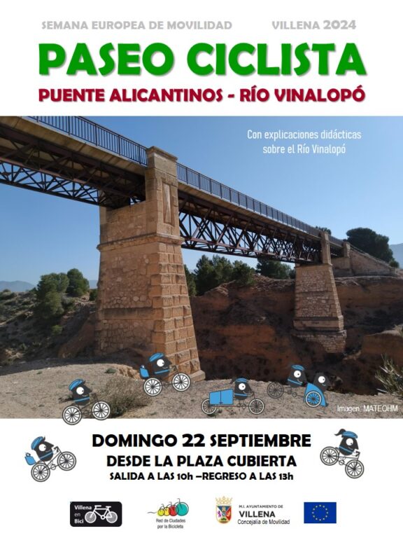 Arranca la semana de movilidad 2024 junto al Ayuntamiento de Villena, con una actividad para todos los públicos. Un paseo ciclista agradable por la Vía Verde del Chicharra en dirección a Biar, con destino a las inmediaciones del Puente de los Alicantinos. Un paseo amable y apto para todas las edades y familias. En esa zona podremos contemplar este bonito puente que cruza el Río Vinalopó. Un puente cargado de historia y vinculado a nuestra historia ferroviaria. Un lugar de gran valor ambiental. Personas del ámbito asociativo nos ilustrarán con una explicación didáctica sobre este “Río Rambla”, su evolución, su flora y su fauna. Una visita para incrementar la toma de conciencia de los valores de este ecosistema, así como las líneas para su protección.