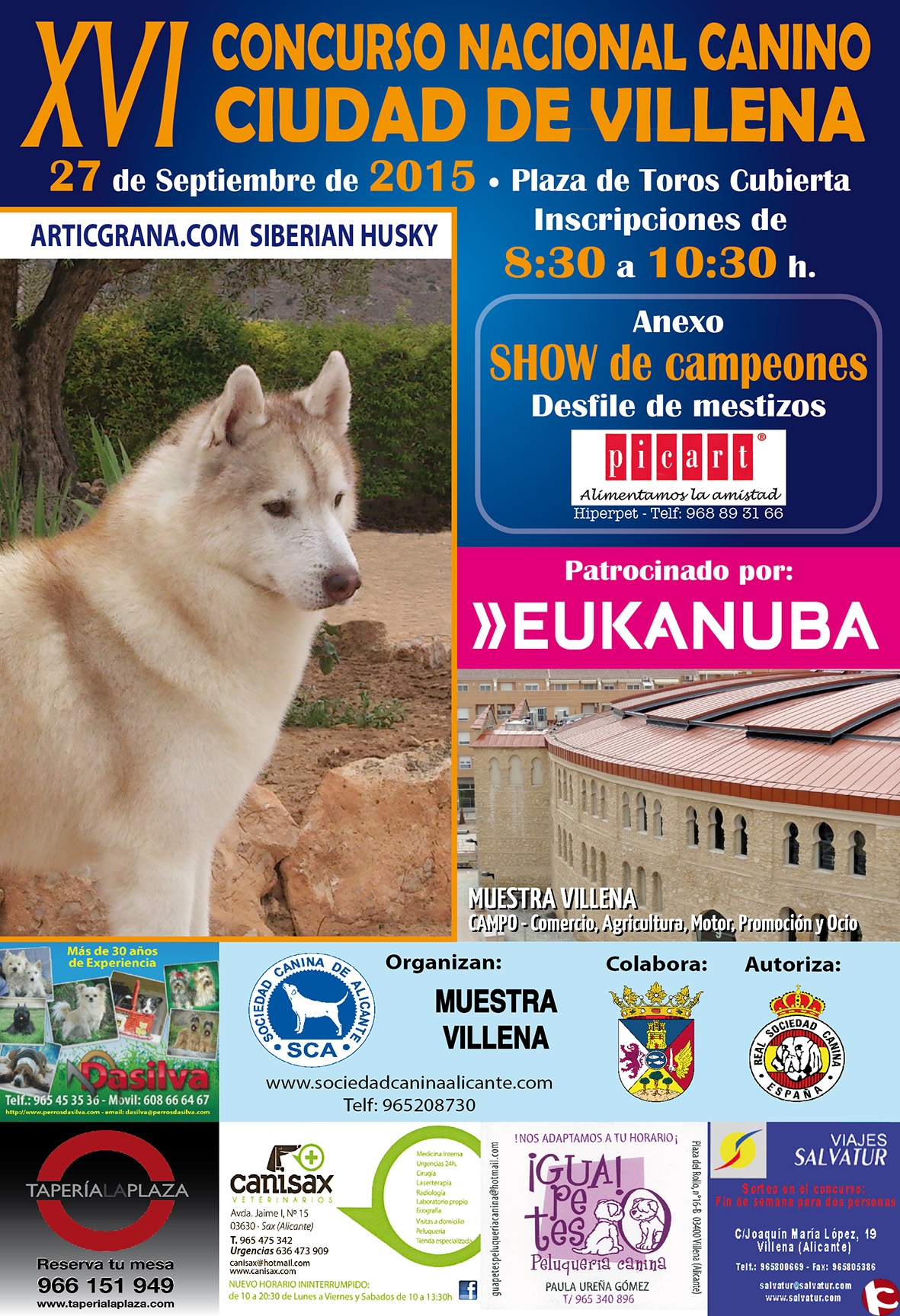 Por otro lado el domingo en la mañana tendrá lugar la XVI edición del Concurso Nacional Canino de Villena. Será a partir de las 10:30 y las inscripciones se abrirán a las 8:30 horas. Habrá una categoría de mestizos que permitirá que cualquiera pueda presentar a su perro al concurso, sea o no de raza. Ahí el jurado establecerá diversos premios por tamaño, obediencia, simpatía… Las inscripciones serán a 5 euros, con la recaudación y la donación de Picart se colaborará con la Protectora de Animales de Villena a través de sacos de pienso.
