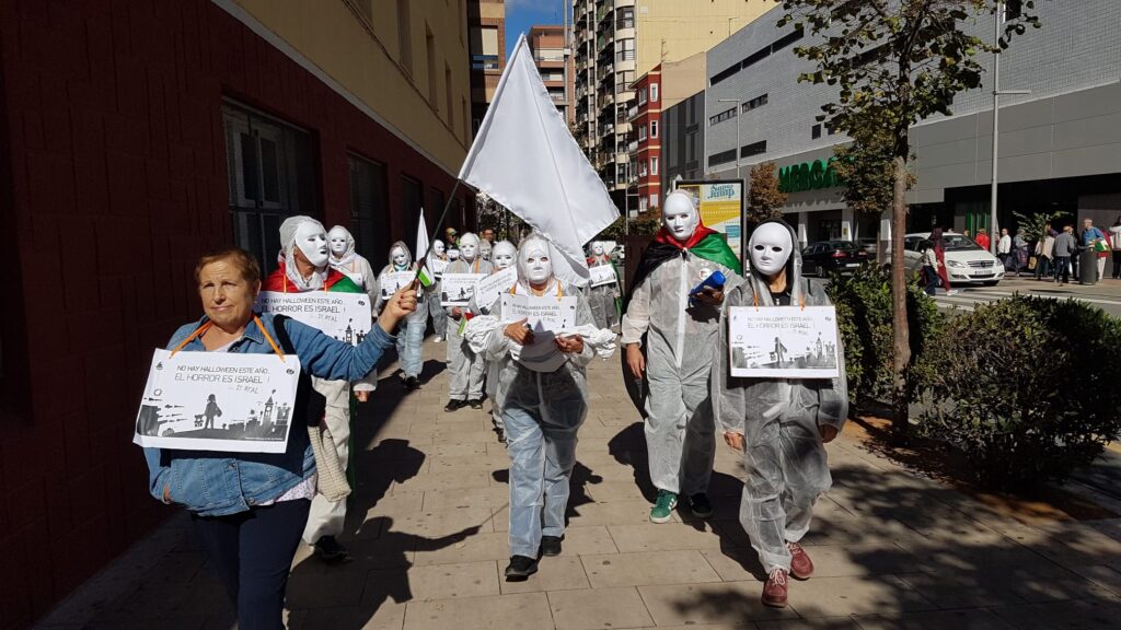 Con carteles que de manera irónica, y jugando con las palabras, señalan que “no hay que celebrar Halloween este año, que el terror es real” (por IS Rael), las personas que se manifestaban han recorrido el centro de la ciudad desde la Plaza del Rollo a la Plaza de toros, pasando por la Corredera y Avda de la Constitución, en un silencio solo interrumpido por el sonido de una alarma antiaérea provocando la sorpresa entre los viandantes.