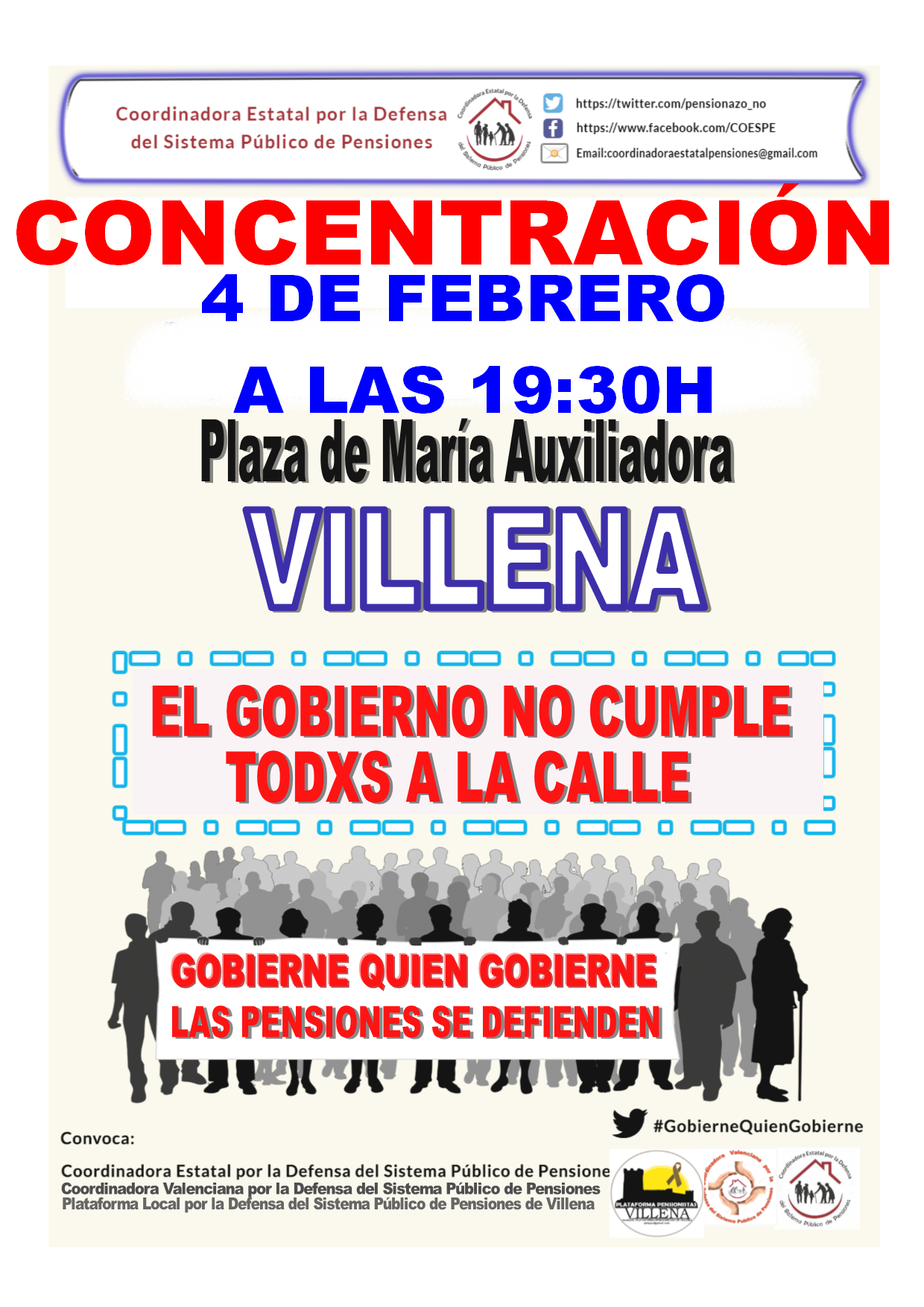 La Plataforma Local de Villena llevará a cabo esta movilización el lunes día 4 de Febrero. Estaremos en la calle reivindicando el restablecimiento de la edad de jubilación a los 65 años y la jubilación anticipada sin penalizar con 40 años o más cotizados. Alcanzar en un plazo de dos años los 1084 euros de salario mínimo y pensión mínima (conforme a la recomendación de la Carta Social Europea) y el Blindaje de las pensiones en la Constitución así como su revalorización real al IPC. Aprovecharemos también esta acción para seguir recogiendo las firmas que se envían al Defensor del Pueblo para que se reconozcan las pensiones como un derecho fundamental de los españoles.