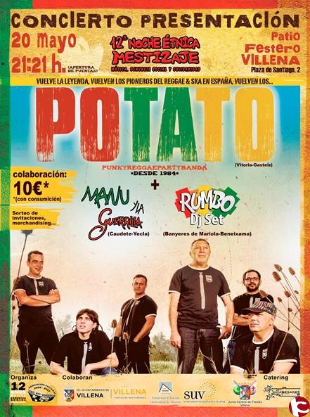 El próximo sábado 20 de Mayo la Asociación Cultural Somos Anti Xenofobia organiza en el Patio Festero de Villena, con la colaboración del Ayuntamiento de esta localidad, un Concierto Presentación de la 12a Noche Étnica Mestizaje. Para ello se contará con la actuación de la mítica banda de Vitoria, POTATO, con más de treinta años de concierto a sus espaldas, traerán a Villena por primera vez sus ritmos jamaicanos y su más que reconocida por el público más fiel «punkyreggaeparty».