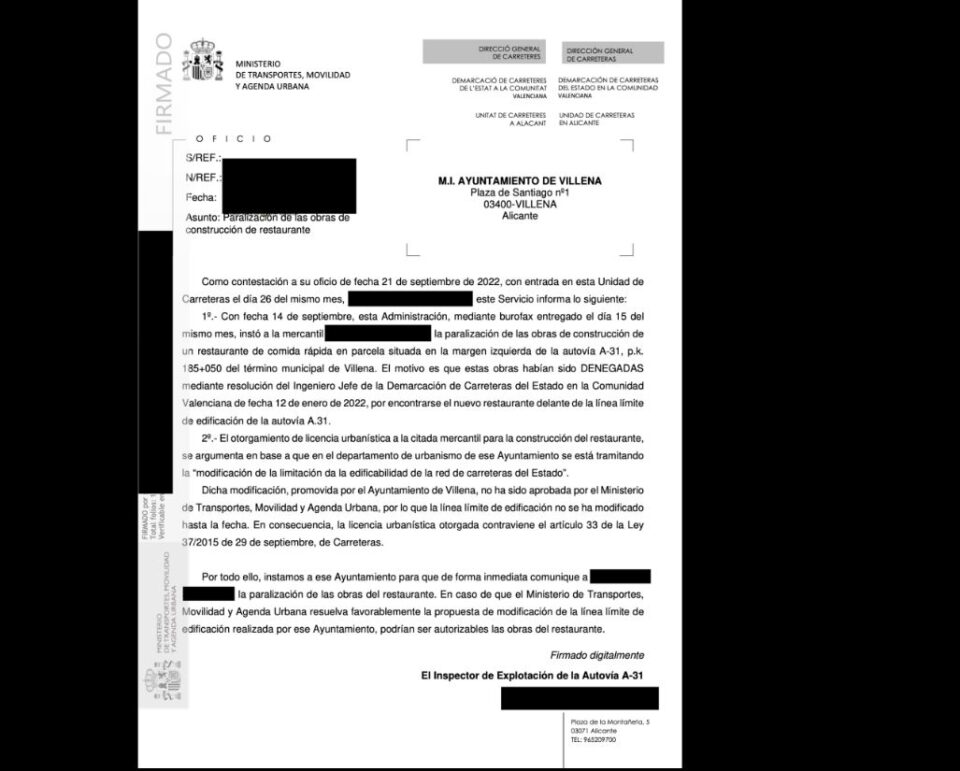 Desde la Dirección General de Carreteras, a través de la demarcación de Carreteras del Estado en la Comunidad Valenciana, se ha emitido un oficio -dirigido al Ayuntamiento de Villena- mediante el cual insta al Ayuntamiento para que “de forma inmediata comunique a la mercantil la paralización de las obras de construcción de un restaurante de comida rápida en parcela situada en la margen izquierda de la autovía A-31”.