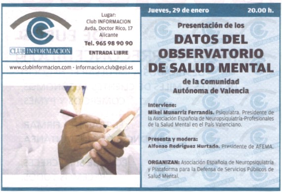 El próximo Jueves 29 a las 20 horas se presentan en el club Información los datos recogidos por el Observatorio de Salud Mental sobre la situación de los recursos sanitarios y sociales para la atención de las personas que padecen una enfermedad Mental. El acto organizado por la AEN y la Plataforma para la Defensa de los Servicios Públicos de Salud Mental,lo presentara Alfonso Rodríguez(Pte de AFEMA) y Mikel Munarriz(Pte de la Asociación Española de Neuropsiquiatría P.V).