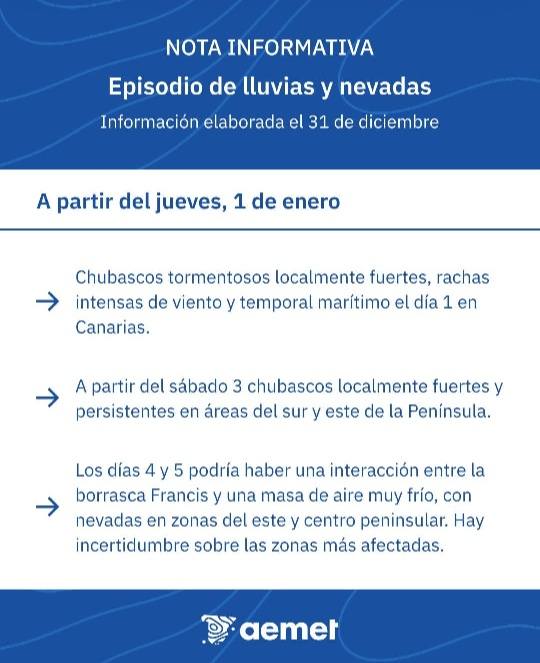 Según la nota informativa de AEMET, a partir del sábado 3 de enero se esperan chubascos localmente fuertes y persistentes en áreas del sur y este de la Península. Además, durante los días 4 y 5 de enero podría producirse una interacción entre la borrasca “Francis” y aire frío en altura, lo que incrementa la probabilidad de nevadas en zonas del este y centro peninsular, aunque todavía existe incertidumbre sobre las áreas más afectadas.
