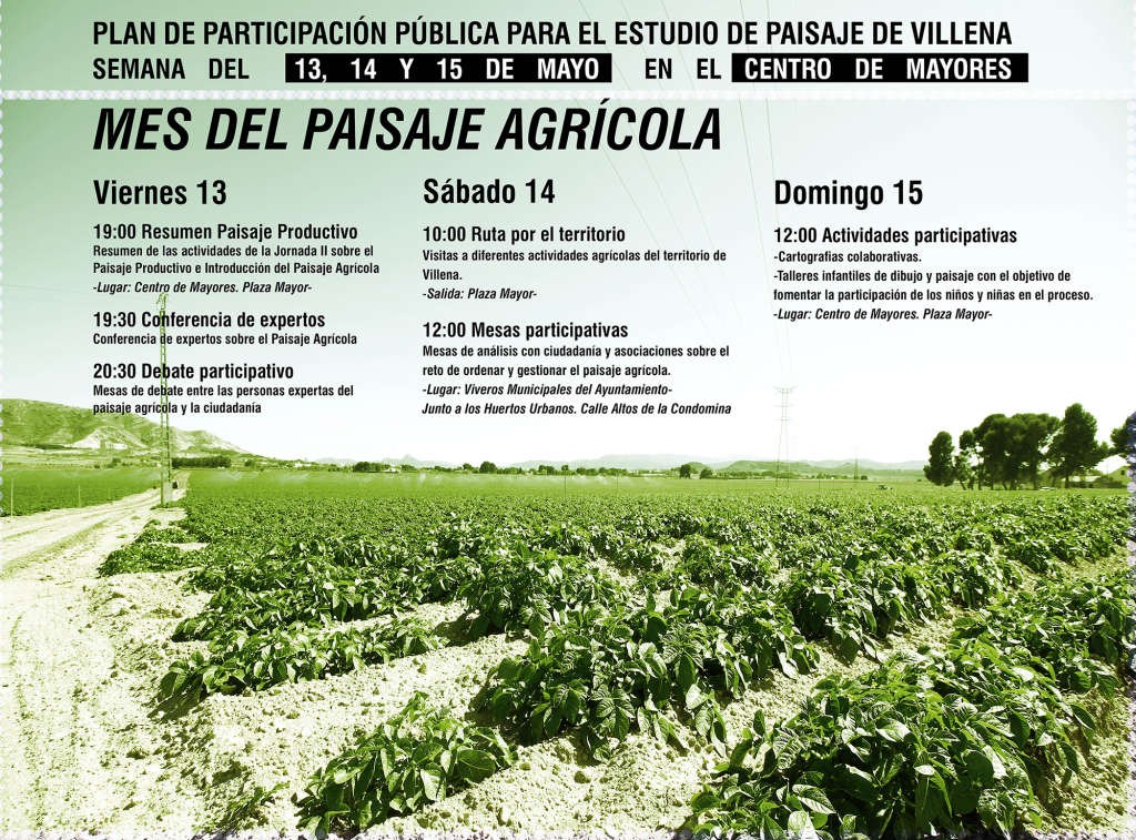 Hoy viernes 13 de mayo tendrá lugar el inicio de la jornada de Proyecto Paisaje Agrícola. Será a las 19:00 horas en el Centro de Mayores de la Plaza Mayor y estará dedicada al terreno agrícola en Villena. En estas jornadas de participación pública mensuales se analizan las distintas áreas del paisaje en los más de 350 kilómetros cuadrados que tiene Villena.