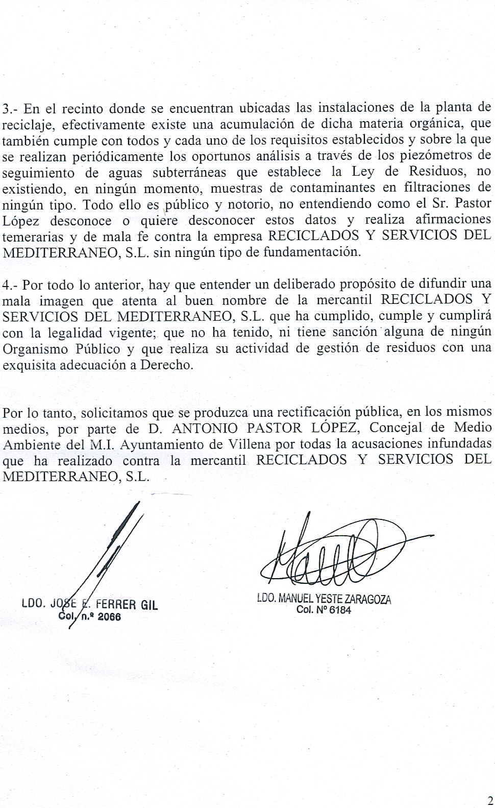 Le ofrecemos el video de las declaraciones del gerente de la empresa Reciclados del Mediterráneo y comunicado del Gabinete Jurídico de la empresa. el motivo es salir al paso de las úñtimas manifestaciones emitidas por el concejal de Medio Ambiente, Antonio Pastor.