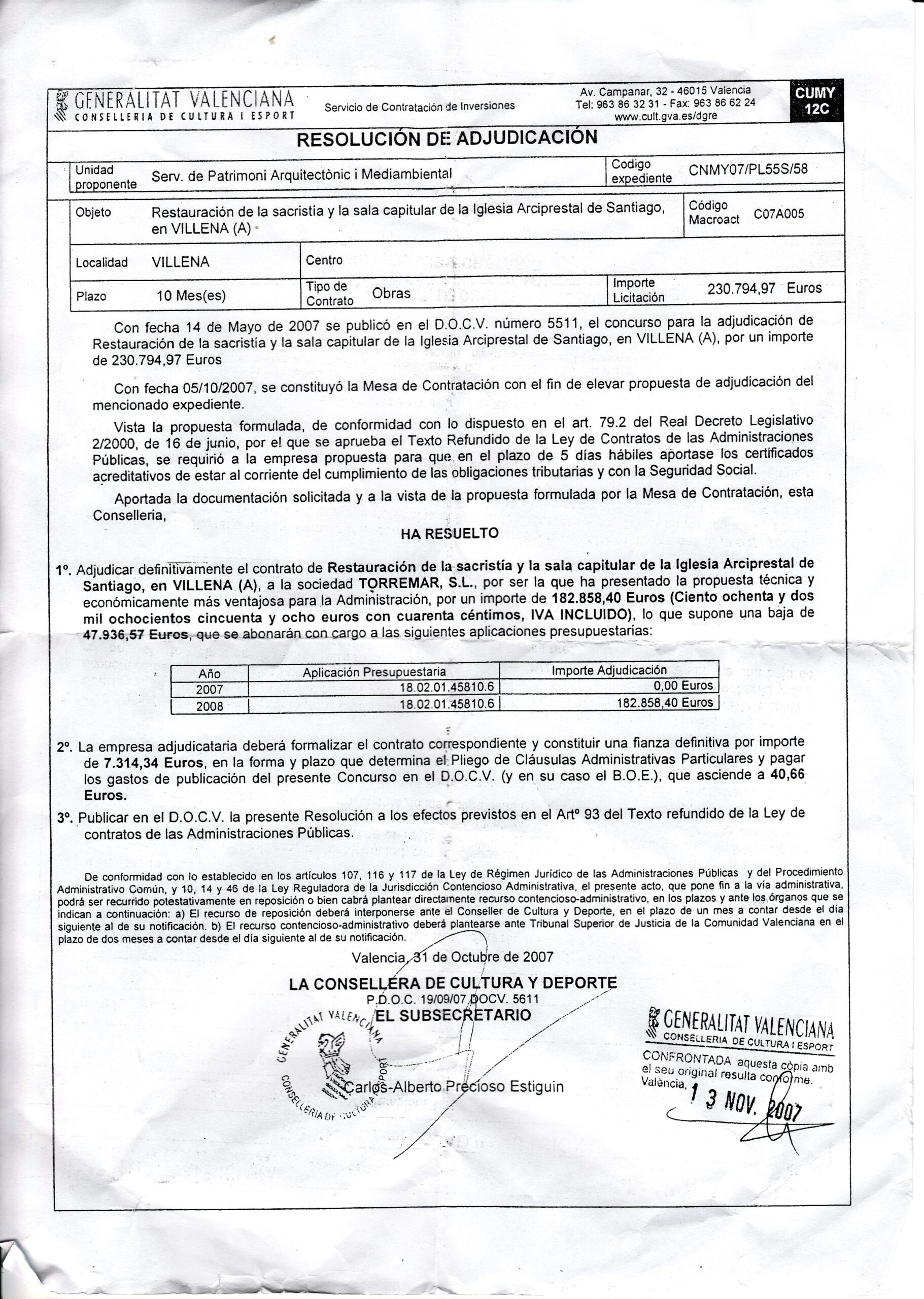 La asociación Amigos de la Iglesia de Santiago es noticia al ser adjudicadas las obras de restauración de la sacristía y sala capitular de Santiago, por un importe de 182.858,40 €. Las obras tendrán un plazo de ejecución de diez meses según el documento.