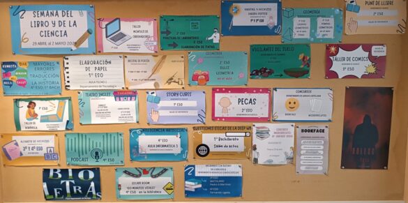 En esta semana, del 29 de abril al 3 de mayo, el IES Hermanos Amorós está inmerso en la Semana del Libro y de la Ciencia con numerosas y variadas actividades.Desde representaciones de teatro en inglés, el estreno de la obra “Adolescer 2055” por parte de la compañía teatral del centro El Carro de Tespis, encuentros con autores, recitales de poesía, errores de traducción, alfabeto de hechizos, story cubes, podcast, talleres de punts de llibre, concursos de microrrelatos y de bookface, elaboración de cómics…propuestos por los Departamentos de las áreas lingüísticas hasta talleres relacionados con las materias más científicas como elaboración de papel reciclado, prácticas de laboratorio, de elaboración de tintas, taller “Pecas”, construcción de cuerpos geométricos con dulces y pompas, bioletras, vigilantes del suelo, talleres de robótica, montaje de ordenadores, inteligencia artificial, escape room…cada una de ellas está orientada a los diferentes niveles del alumnado de Secundaria y Bachillerato del centro.