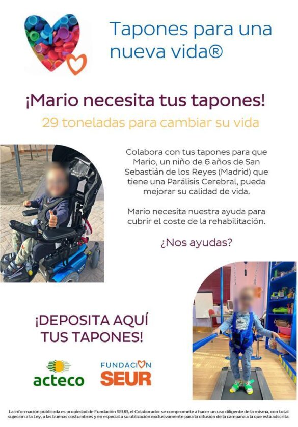 En estos momentos la Fundación Seur se encuentra trabajando para Mario, un niño de 6 años de la localidad madrileña de San Sebastián de los Reyes, aquejado de parálisis cerebral infantil (PCI). Gracias a esta campaña “tapones para una nueva vida”, podrá mejorar su nivel de vida al tener ayuda para cubrir los costes de la rehabilitación. Mario necesita unas veintinueve toneladas de tapones para conseguir subir ese pequeño escalón en su vida. Aquí en Villena, deseamos aportar nuestro granito de arena con casi las 5 toneladas, que ya prácticamente se encuentran recogidas.