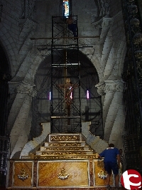 Los hermanos Carrasco cada año, son los encargados de montar el amplio Altar Mayor. «Es un trabajo que se hace con mucho orgullo, lleva su tiempo pero es emotivo», comenta uno de los hermanos. En esta ocasión hablamos con Ricardo Sáez, recibió en su día un encargo de Antonio Hernández Hernández, presidente de la Junta de la Virgen para construir un nuevo sistema para elevar a la patrona en el altar mayor. El anterior estaba muy viejo, al ser construido hacemos de 100 años.