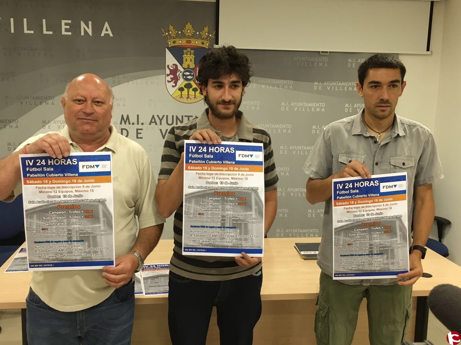 El concejal de Deportes acompañado por el Gerente de la Fundación Deportiva y Pepe Esteve como organizador de la Liga Local de Fútbol Sala han presentado esta mañana la nueva edición de las 24 horas de fútbol sala que se celebrarán en el polideportivo municipal. El torneo está diseñado para 18 equipos aunque han sido más de 20 equipos los que han preguntado y se han interesado.