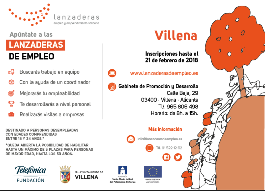El programa está impulsado por Fundación Santa María la Real, Fundación Telefónica y el Ayuntamiento de Villena. Un proyecto que cuenta con la cofinanciación del Fondo Social Europeo, dentro del programa operativo POISES. Las personas interesadas pueden inscribirse en la web del programa Lanzaderas o en formato presencial en el Gabinete de Promoción y Desarrollo.