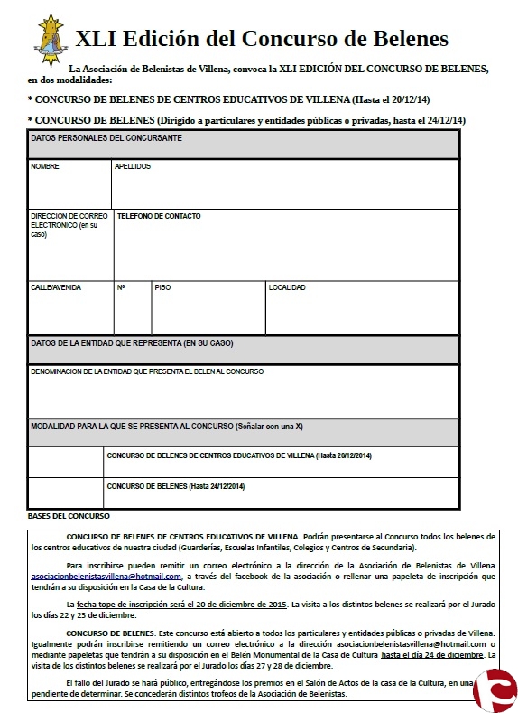 Por ello os invitamos a participar y os dejamos las bases para que tengáis conocimiento de las mismas y el formulario que tendréis que rellenar para que podamos ir a visitaros y valorar vuestro belén en los días siguientes al Día de Navidad. Los datos los podéis enviar por mail (asociaciondebelenistasdevillena@hotmail.com), mensaje privado de Facebook (Asociación de Belenistas de Villena) o dejarlos por escrito en la propia secretaría de la Casa de la Cultura. Los impresos os los podéis descargar de aquí directamente, o bien recogerlos en la misma Casa de Cultura. ¡Os esperamos a todos/as! Y sobre todo deseamos que paséis unos felices días y el año que se presenta sea buenos tiempos para disfrutar. ¡¡Feliz Navidad!!