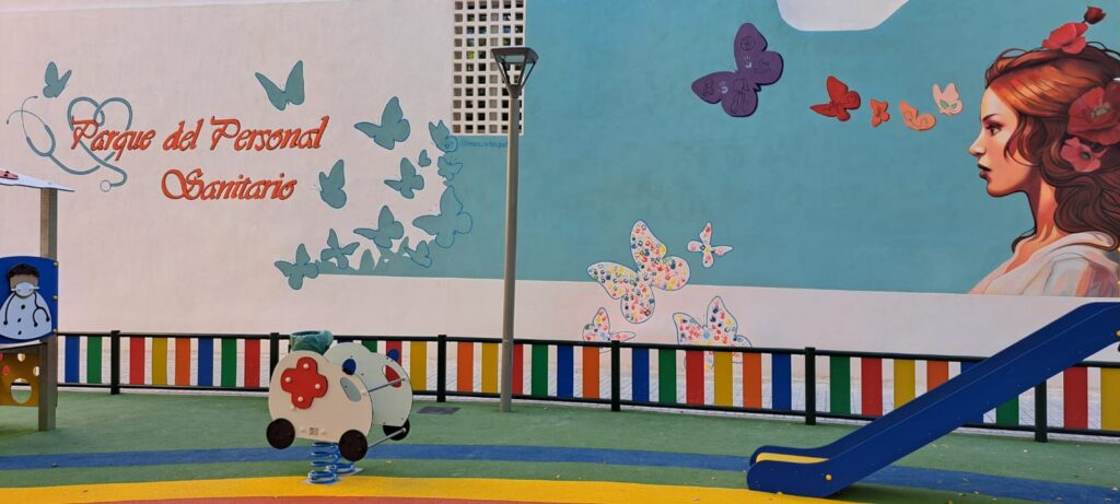 Villena, 3 de octubre.- Un mural de 100 metros cuadrados corona una de las paredes que circundan el nuevo parque renovado integralmente y que ha sido renombrado como Plaza del Personal Sanitario en honor y reconocimiento de todos los trabajadores del sector que actuaron durante lo peor de la pandemia de la Covid-19, según ha comentado hoy el alcalde de la ciudad, Fulgencio Cerdán.