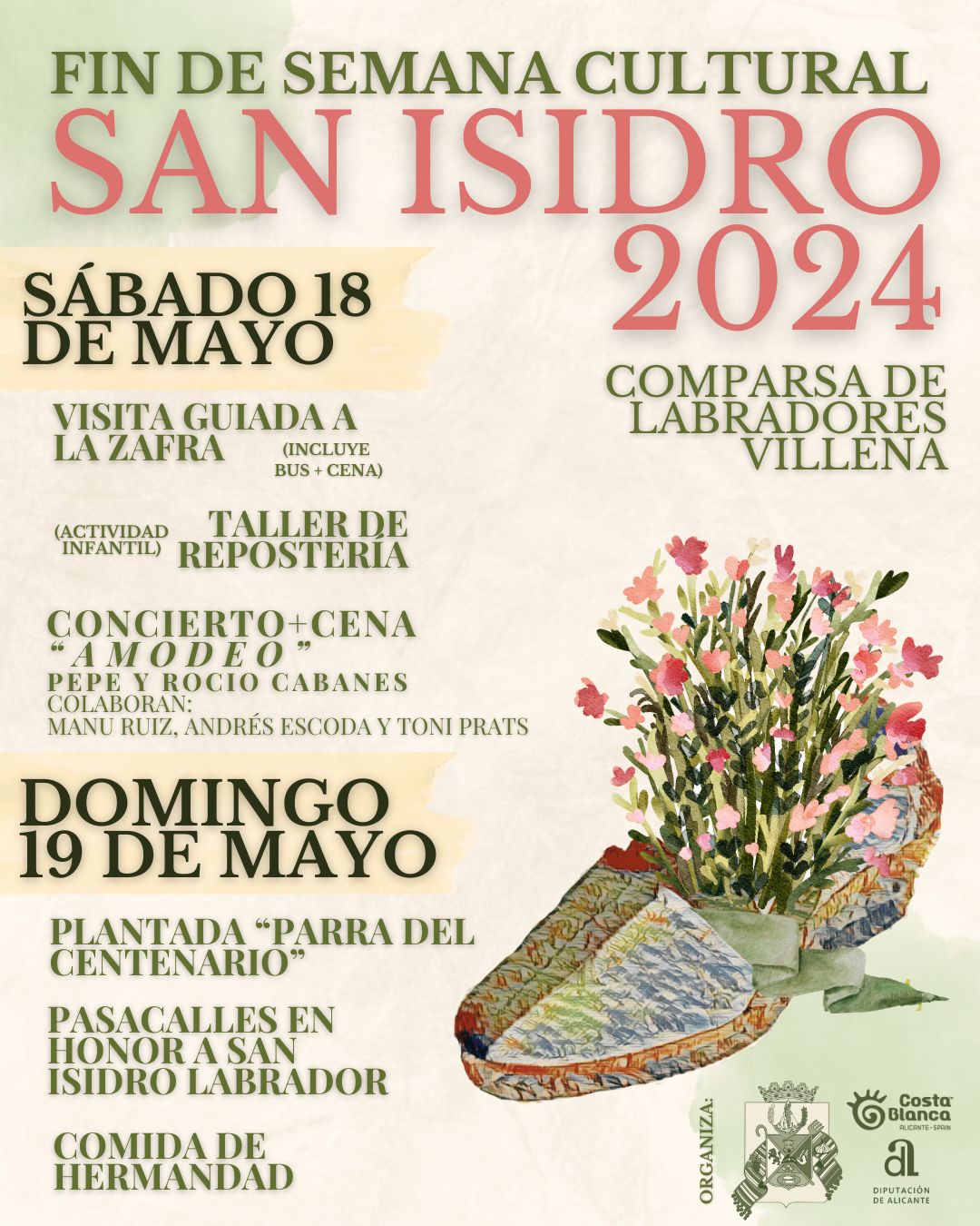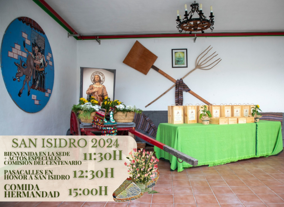 El sábado 18 de mayo se realizará una excursión a La Zafra. Esta partirá en autobús desde la Plaza del Rollo a las 18:00h. Una vez allí habrá una visita guiada a los principales lugares de interés de la pedanía a cargo de Jesús García, seguida de una ofrenda al santo por parte de nuestros Cargos. De esta manera compartimos lazos junto a la Asociación de Vecinos de La Zafra, que tiene por patrón a San Isidro. Esta asociación nos despedirá con un vino de honor.