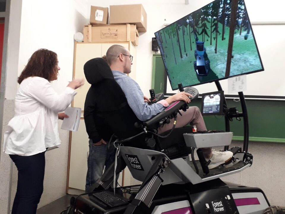 El simulador LOGSET, de la empresa ForestPioneer, ha sido cedido al instituto durante casi un mes por la Conselleria de Educación. Se trata de un simulador realista que permite la realización de prácticas de conducción y manejo de una procesadora y una autocargadora forestal.