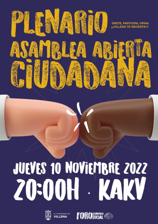 Este proximo jueves 10 de noviembre de 2022 celebra el Foro Económico y Social de Villena una nueva Asamblea Abierta Ciudadana. Cada trimestre es convocado el Plenario de representantes de las sensibilidades económicas y sociales para formalizar los acuerdos adoptados y ser motivo de encuentro de los diferentes grupos de trabajo y escaparate abierto a la ciudadanía, que puede hacer consultas y propuestas.