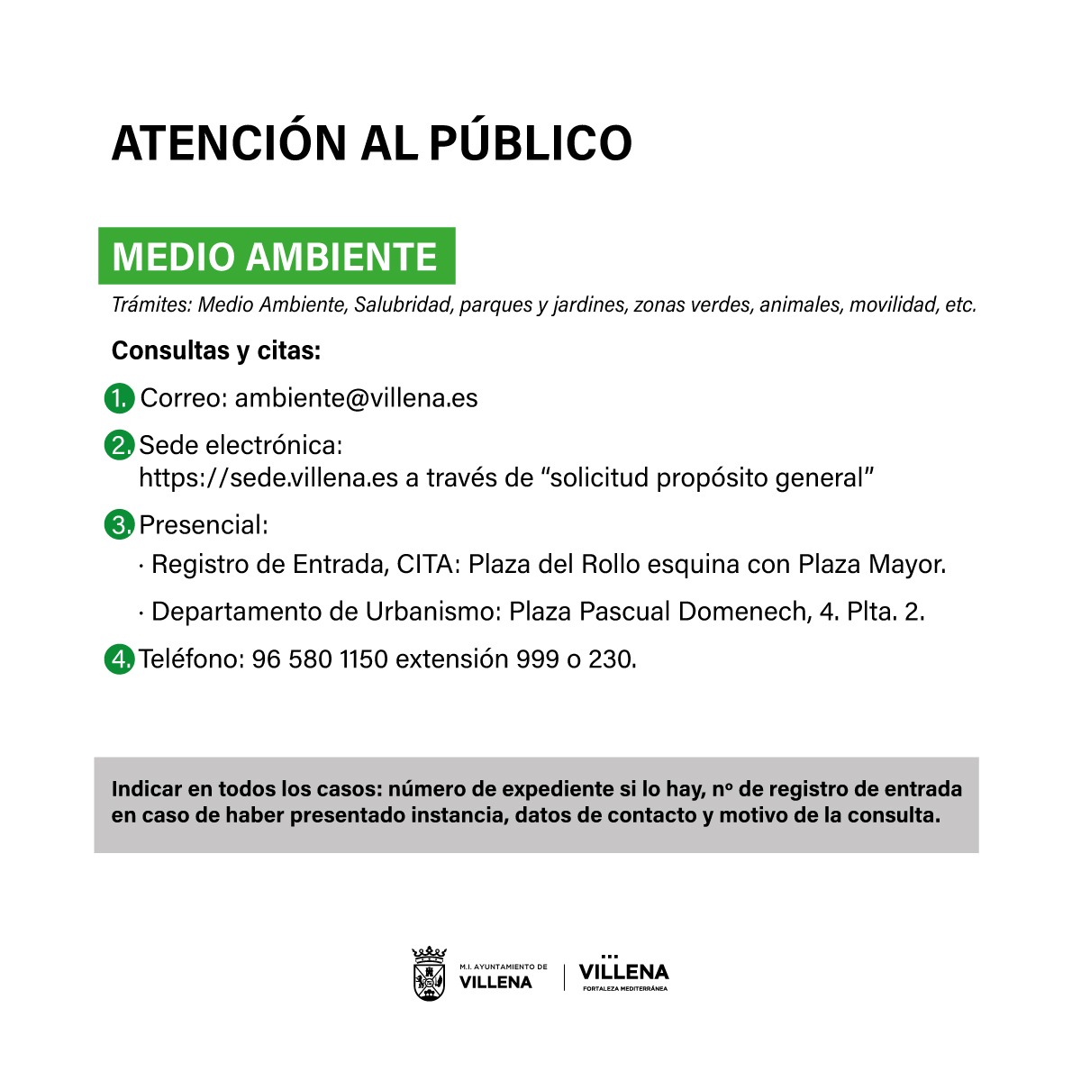 • Info.urbanismo@villena.es en el caso de Urbanismo o ambiente@villena.es para cuestiones relativas a Medio Ambiente.