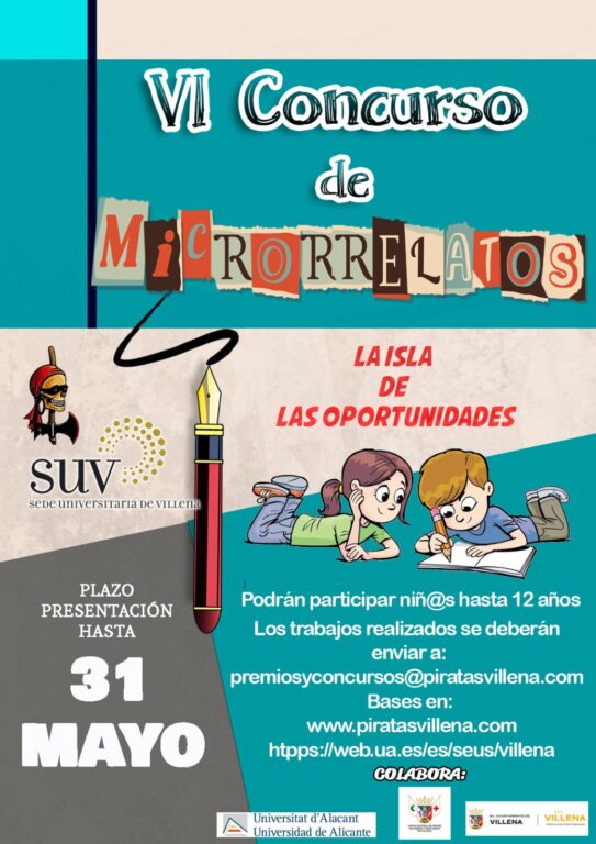 Con el lema «La isla de las oportunidades», los pequeños escritores, hasta 12 años, tienen la oportunidad de demostrar su incipiente vena literaria, derrochando ingenio e imaginación. Las obras concursantes en el «VI Concurso de Microrrelatos « se podrán presentar hasta el 31 de mayo de 2024, mediante correo electrónico dirigido a la siguiente dirección: premiosyconcursos@piratasvillena.com, o también se podrá enviar por correo postal, dirigido a la sede de la Comparsa de Piratas, sita en calle Ferriz, 6, Villena 03400, Alicante, o a la Sede Universitaria de Alicante en Villena, cuya dirección es: calle de la Tercia,12, Villena 03400, Alicante.