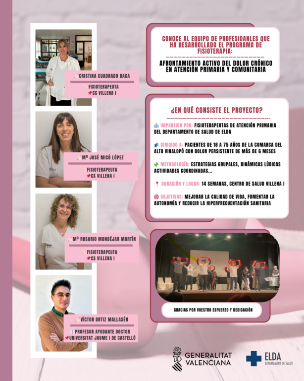 El programa, que se desarrolla en el centro de salud Villena I desde marzo de 2023, tiene una duración total de 14 semanas y combina estrategias grupales, dinámicas educativas y ejercicio físico terapéutico. Su finalidad es mejorar la calidad de vida de las personas participantes, promover su autonomía y reducir la hiperfrecuentación sanitaria asociada al dolor crónico.