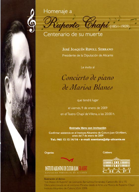 La Diputación de Alicante, a través del Instituto Juan Gil Albert en colaboración con el Ayuntamiento de Villena continúan con la programación con motivo del centenario de la muerte de Ruperto Chapí Lorente. El próximo viernes tendrá lugar en el Teatro Chapí de Villena un concierto de Piano de Marisa Blanes a las 20h, donde interpretará obras de piano del famoso compositor.