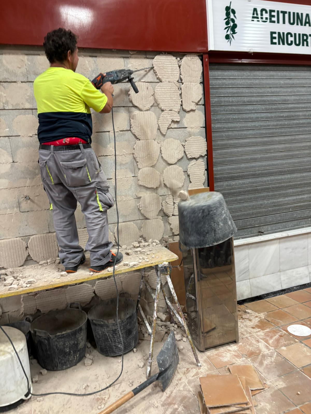 • Equipamientos municipales: reposicionamiento de azulejos en una pared del Mercado Municipal, garantizando el buen estado del edificio y la seguridad de usuarios y comerciantes.