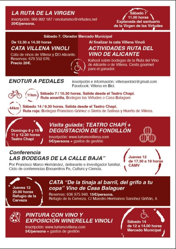 El programa incluirá también el túnel del vino, una experiencia para degustar vinos con Denominación de Origen Alicante en el obrador del Mercado Municipal; ‘La ruta de la Virgen’, con salida desde la explanada del Santuario de Nuestra Señora de las Virtudes; la cata ‘Villena Vinoli’ y diversas actividades vinculadas a la Ruta del Vino de Alicante.