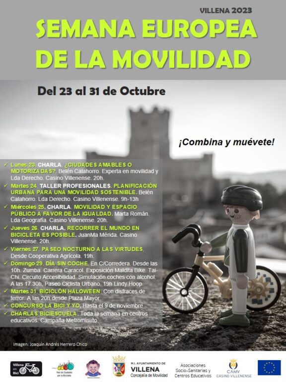 El miércoles 25 de octubre la charla sobre ‘Movilidad y Espacio Público a favor de la Igualdad’ la impartirá Marta Román, experta en geografía, movilidad y género. El jueves, 26 de octubre el tema central será la bicicleta. El villenense Juanma Mérida será el encargado de hablar sobre ‘Recorrer el mundo en bicicleta es posible”. El viernes 27 se ha organizado un paseo nocturno en bicicleta desde la Cooperativa Agrícola hasta las Virtudes, al que se invita a toda la ciudadanía a participar. El domingo 29 de octubre será el Día Sin Coche del que ya se detallarán todas las actividades más adelante.