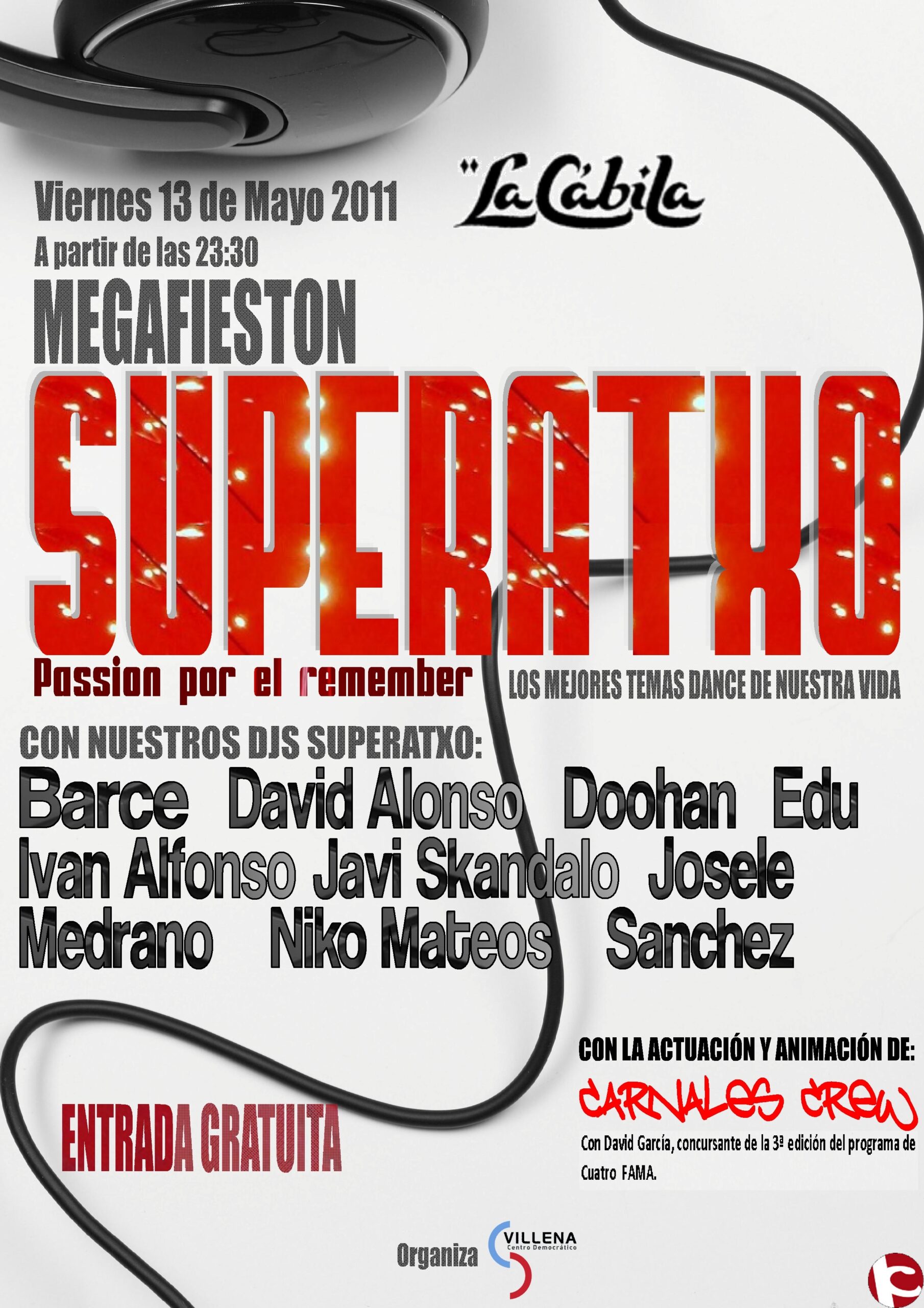 A esta hora comenzará un gran espectáculo donde se darán cita algunos de los mejores Dj´s de la zona. Hasta 10 Dj´s de primer nivel harán disfrutar a los asistentes de la noche de La Cábila repasando, en versión Remember, los mejores temas dance de hace algunos años. Además de esto también se contará con la presencia, en esta noche de fiesta, con el grupo de baile Carnales Crew.