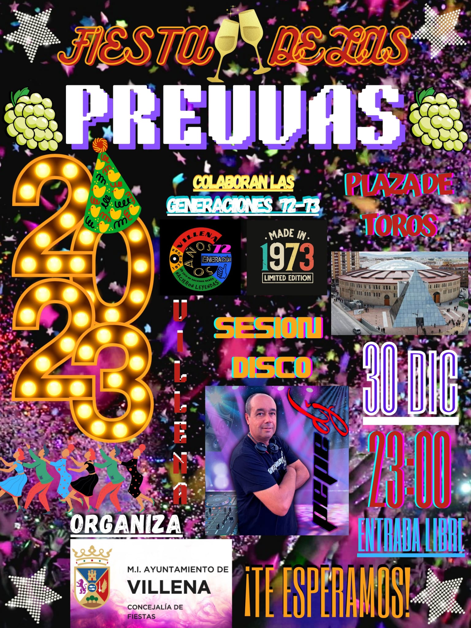 Villena, 27 de diciembre de 2022.- La Concejalía de Fiestas ha organizado dos eventos para cerrar 2022 y abrir 2023 con sendos eventos que tendrán lugar en la Plaza de Toros, de carácter gratuito y abierto al público general. El 30 de diciembre se realizará la actividad de las pre-uvas, que cuenta con la colaboración de las Generación de 1972-1973, y que se celebrará a partir de las 23.00 horas.