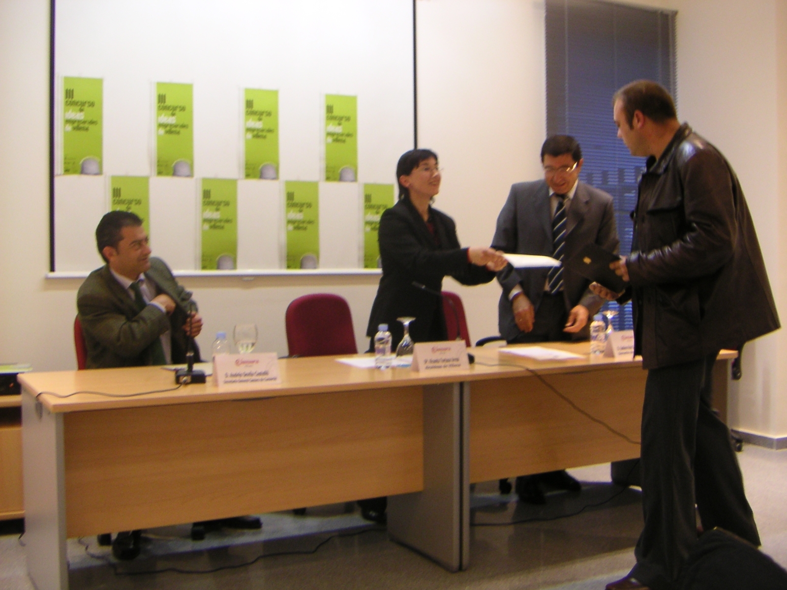 Durante el acto se entregaron diplomas a los 21 participantes que presentaron un total de 14 proyectos. Además, el jurado adjudicó dos premios: un primer premio dotado con 3.400 €, patrocinado por SAICO, S.A., que recayó en Miguel López Amorós por su proyecto “Combustible de origen vegetal”; y un segundo premio de 1.700 € que fue entregado al equipo formado por Josefa Estevan Calatayud, Sonia Martín Sanchos y Mª del Mar Hernández Ibáñez, por su proyecto “Cuidem”. En ambos casos se les ofrece la oportunidad de instalarse en un despacho del Vivero de Empresas durante 6 meses sin costes de arrendamiento. Con esta ayuda se pretende facilitar la transformación de ideas genéricas que puedan tener emprendedores jóvenes y no tan jóvenes, en proyectos empresariales concretos y viables, facilitando el soporte y apoyos necesarios para el desarrollo y consolidación de dicho proyecto.